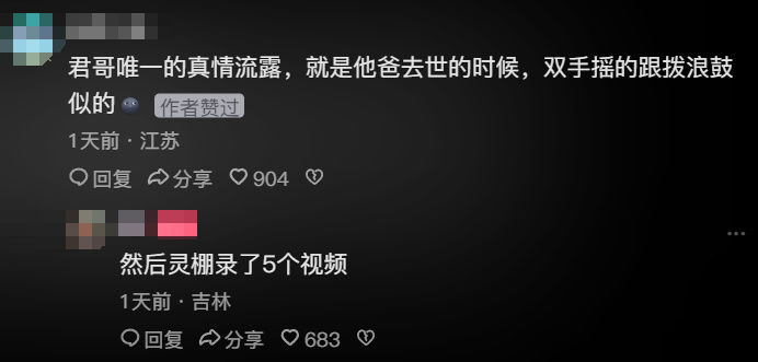 就连君哥的父亲在直播中突然逝世这一事实,也在网友的解读下难以分辨究竟是真情流露还是逢场作秀。这是因为,君哥虽然在一阵呼天抢地后就关闭了直播,但转头在父亲的灵堂上又发了几条短视频,聊以告慰父亲的在天之灵。