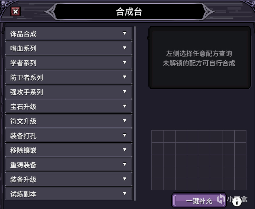 前期玩家在“合成臺”處只能看到非常基礎的“飾品合成”、“符文升級”、“寶石升級”。隨着後面在鍊金師及其他交易性NPC處購買到的各種圖紙後,可解鎖出如下圖一樣衆多的玩法。