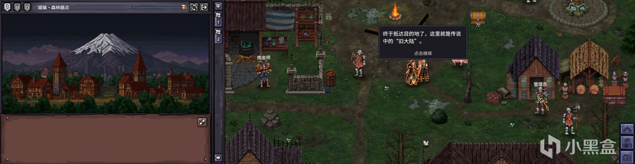 下圖爲遊戲的整體頁面,左邊可以觀看玩家小隊的戰鬥情況,右邊則是遊戲的城鎮畫面,中間的是我們的小人,會根據玩家鼠標的點擊走動到各個地方找NPC接任務或者買賣物品。