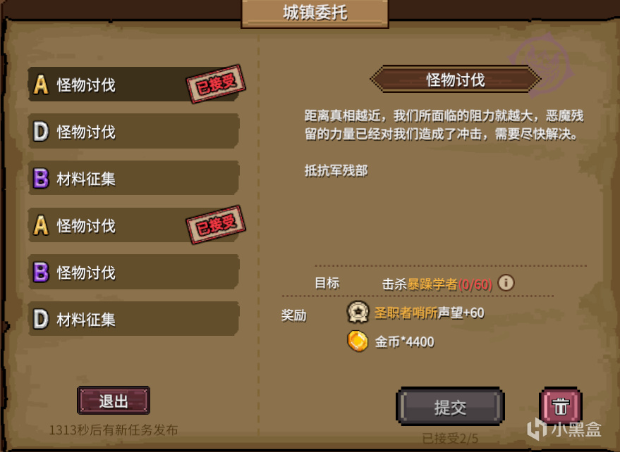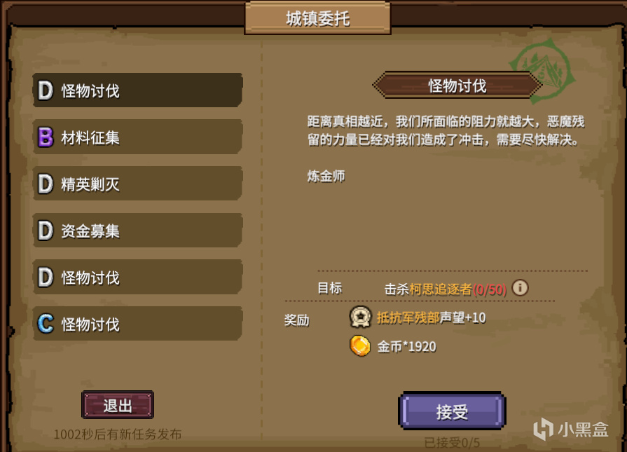 而材料徵集需要玩家分解“精良以上的裝備”後獲得的材料來完成。怪物討伐之類的會在任務頁面感嘆號處看到其出沒的地點,不需要滿世界的尋找。