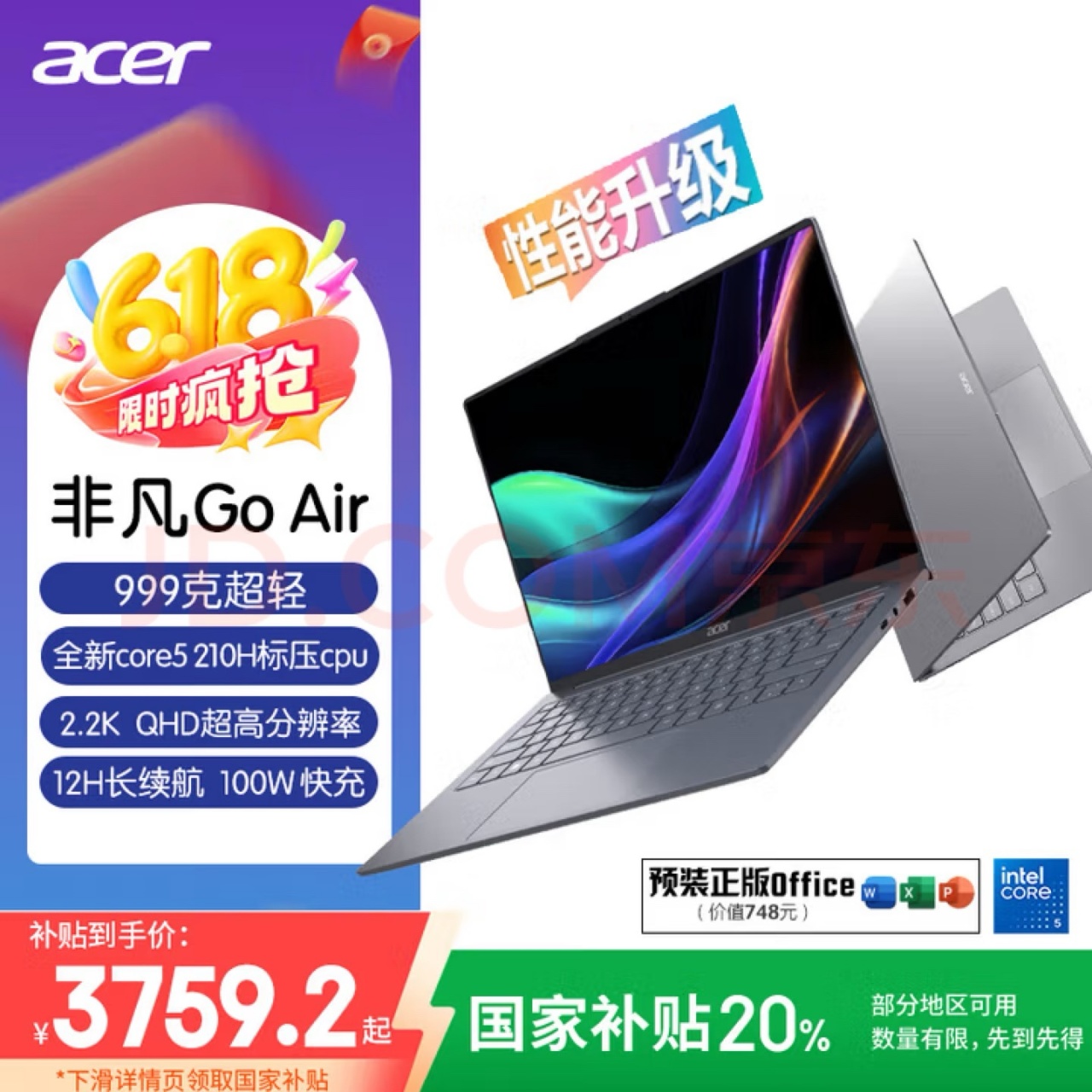 宏碁非凡Go Air ,作为时尚圈的宠儿,以其999克的超轻重量和卓越性能,重新定义了轻薄本的标准。搭载英特尔酷睿200系列处理器,可选酷睿5 210H或酷睿7 240H,确保了强劲的性能输出。