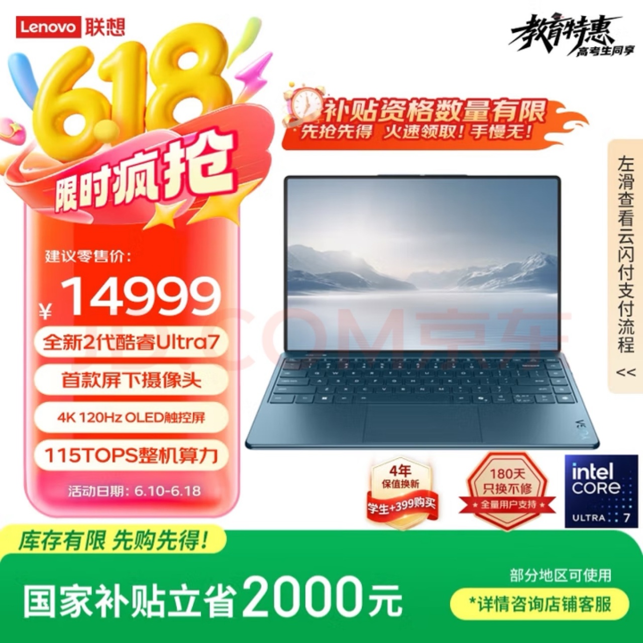 这款笔记本配备了32GB LPDDR5内存和1TB PCIe4.0 SSD,无论是多任务处理还是大型文件存储,都能轻松应对。其2240×1400分辨率的14英寸IPS屏,支持180度开合,提供了出色的视觉体验和灵活性。