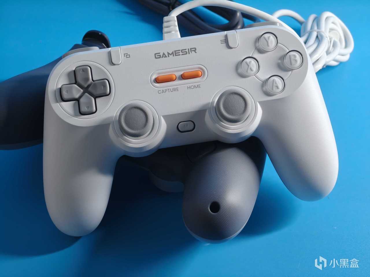 搖桿方面,靈狐的兩個對稱雙搖桿都是採用了小雞定製的霍爾搖桿,有500萬次壽命,2025年的現在霍爾搖桿現在也是主流方案了。搖桿爲帶5%的死區的圓形軌跡,支持切換爲0死區的方形軌跡。搖桿外圈也是貼心的加上了防磨pom環,好評。除此之外正面還有五個功能鍵,左上角爲窗口鍵,右上角爲設置鍵,中間區域右側爲Home鍵,Home鍵旁還加了一鍵截圖鍵,你沒看錯是截圖鍵。兩個搖桿中間還有個多功能的M鍵,並且還帶有指示燈效。
