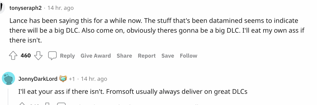 通過之前挖掘的數據內容,很多網友也確信,《艾爾登法環》肯定會有大型DLC。