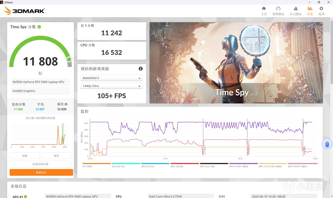 野獸模式下調用RTX5060,可以做到11242的顯卡分數,對比上代4060提升10%,算是一個合理提升,沒有非常擠牙膏。這個表現跟5060遊戲本沒區別。玩一些大型遊戲沒問題。