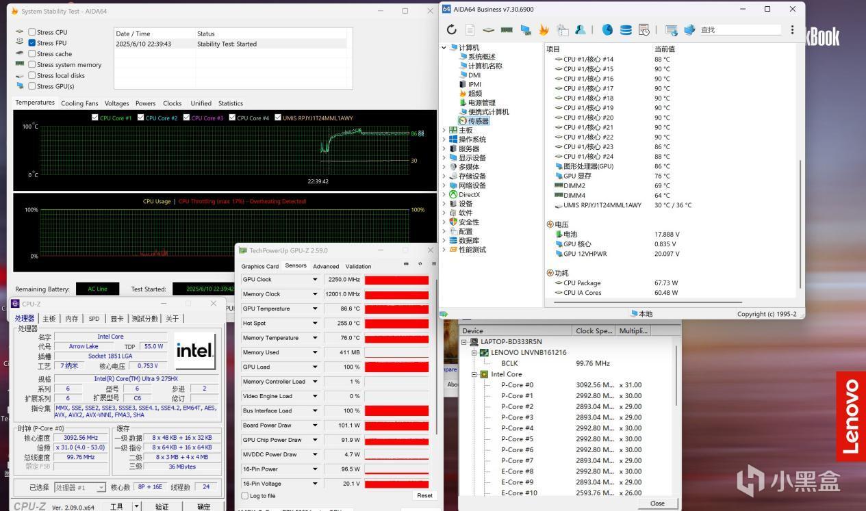 保持室溫26℃,在野獸模式下,CPU滿載能跑到67W,大核3.0G,小核2.5G,屬於還不錯的頻率,保證CPU基礎運算能力,而非被顯卡全喫掉。CPU溫度來到90℃,這個溫度在移動端算正常溫度且偏低一點。顯卡則是卡在100W,偶爾會到103W。頻率2250MHz。