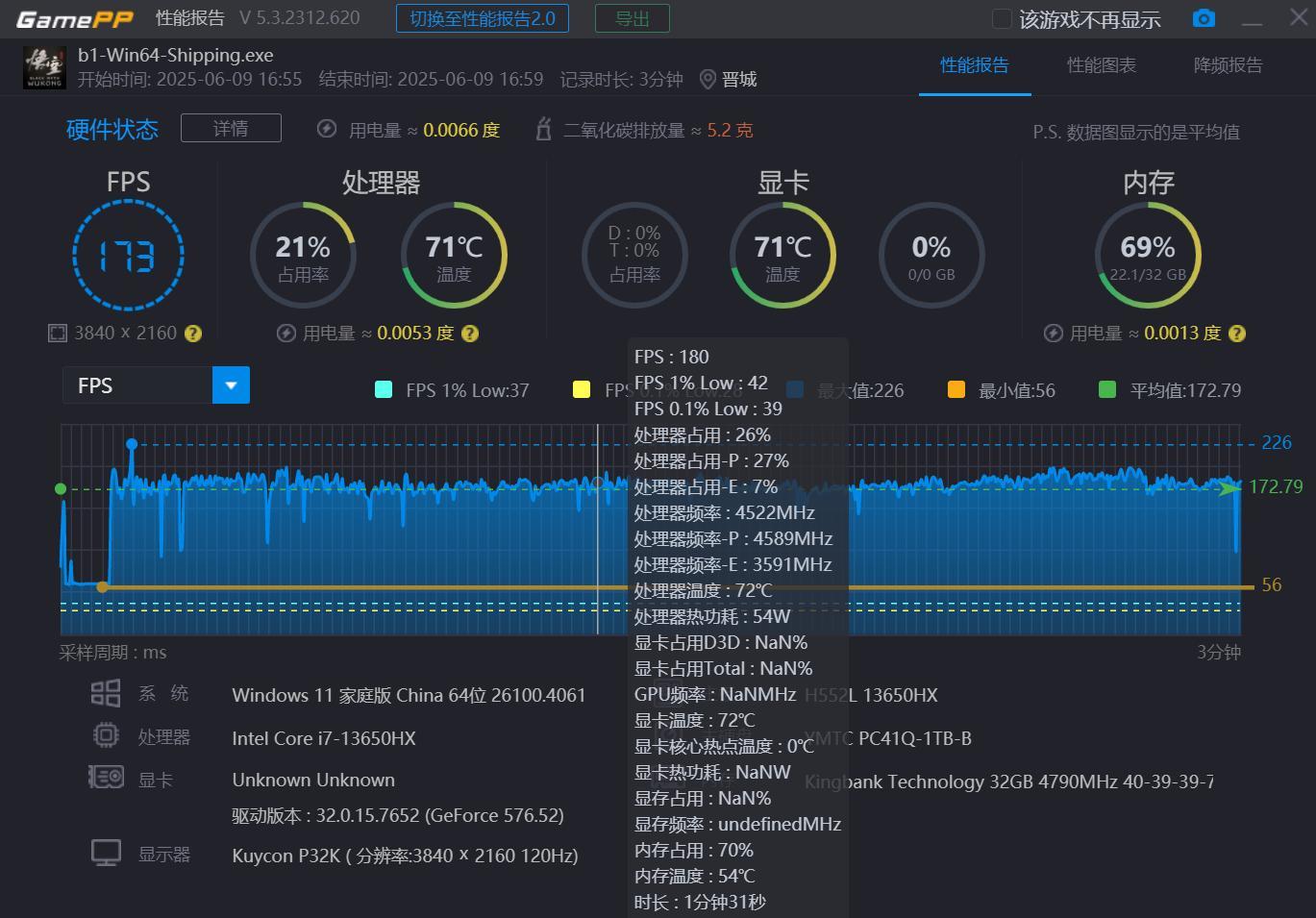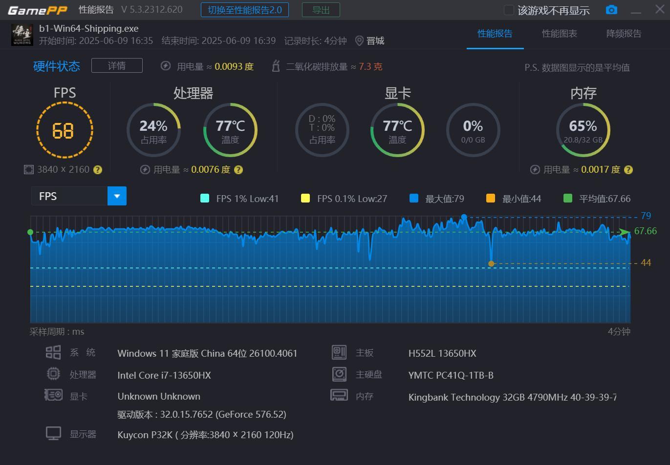 平均帧率99,最低帧90,丝滑无比。对比我以前测过的数据,比4060Ti台式机多了8帧,老黄,真有你的。