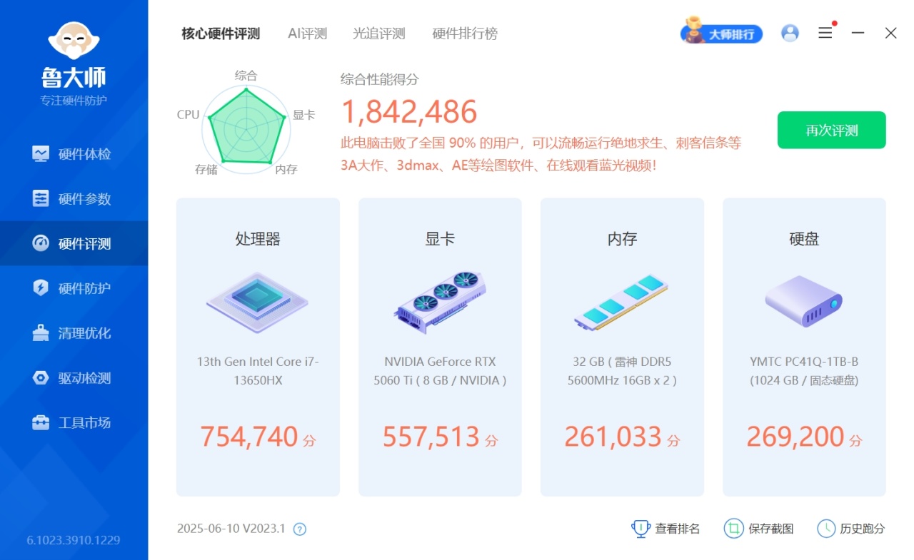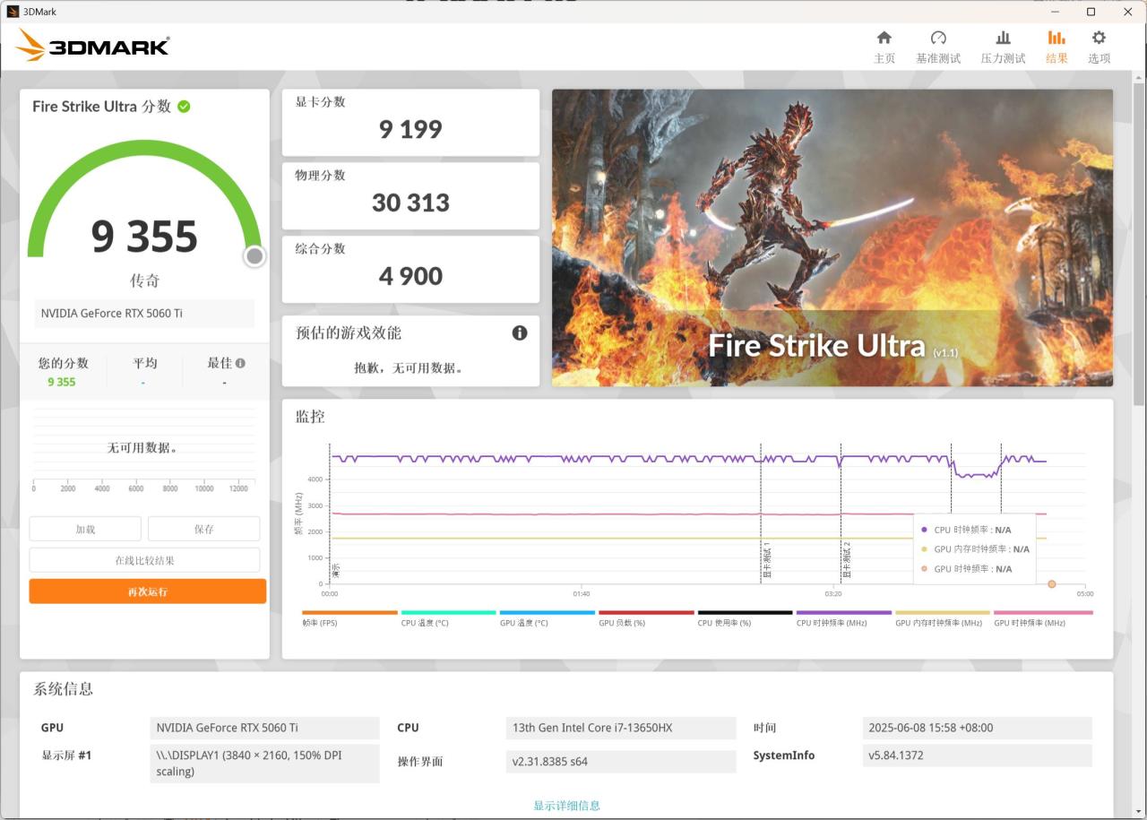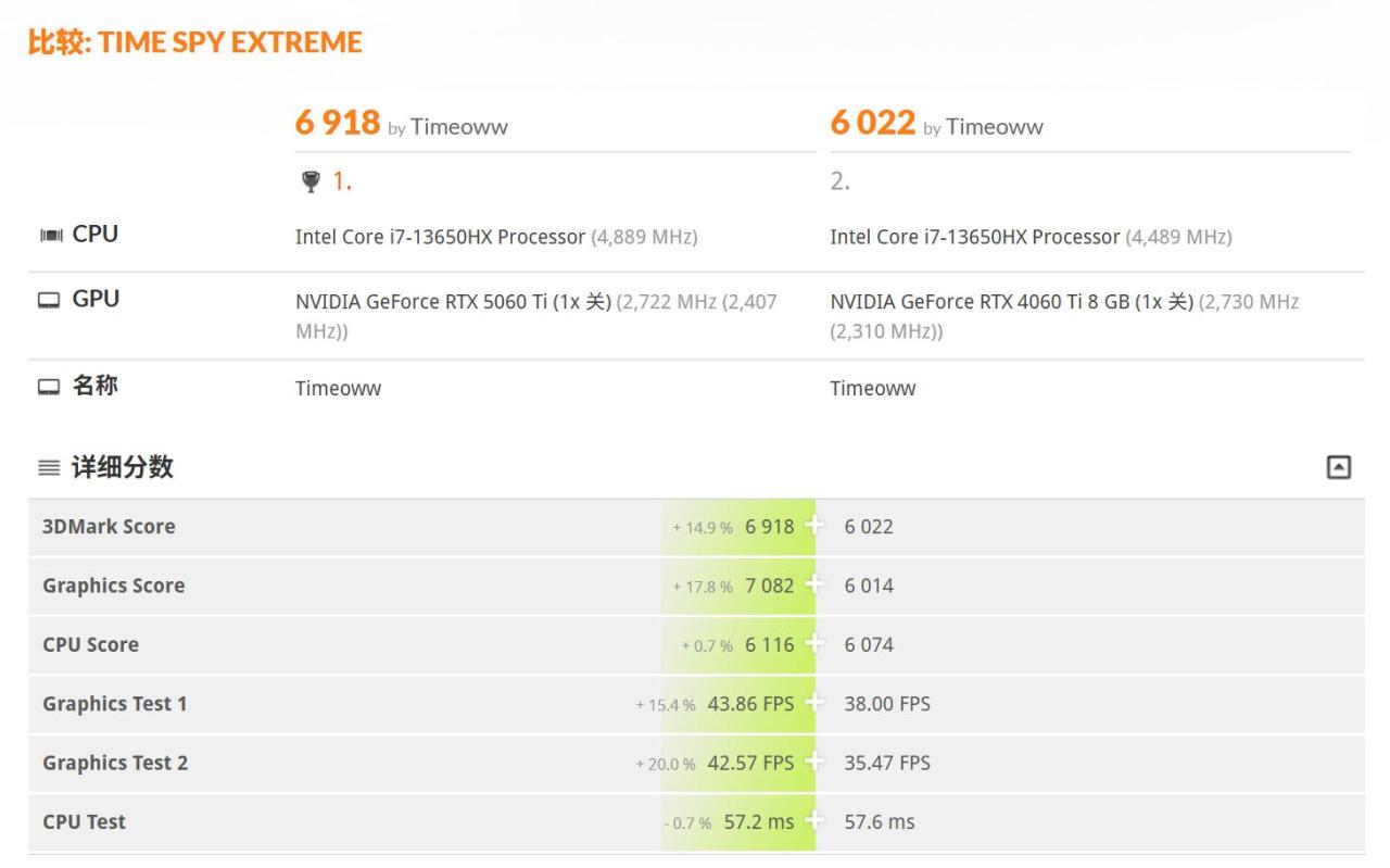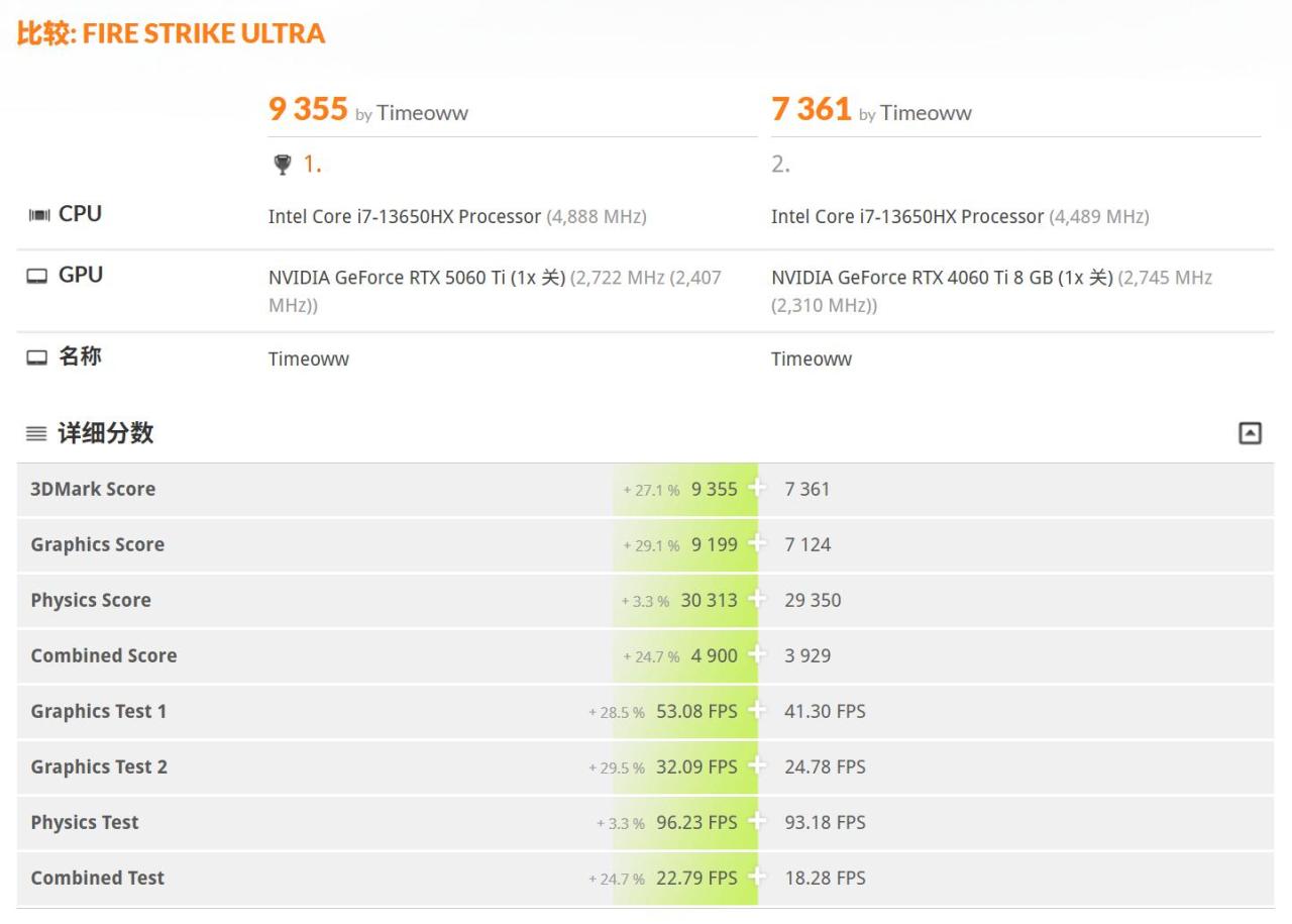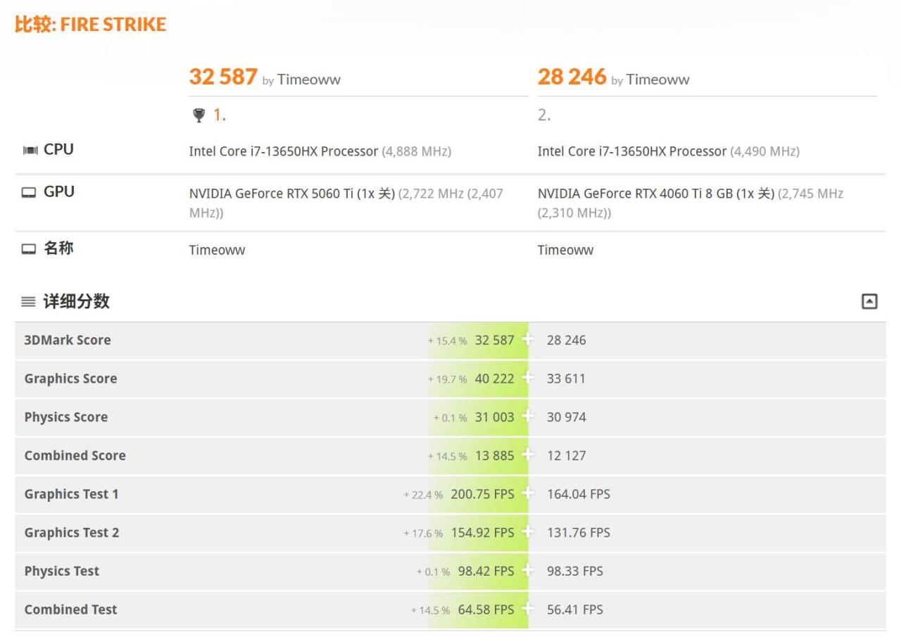 我此前测试过一台13650HX+4060Ti的MoDT机型,所以下面的测试中,我会将机械师曙光S的分数与之相比,大家可以直观的看到搭载5060Ti的机械师曙光S的性能提升: