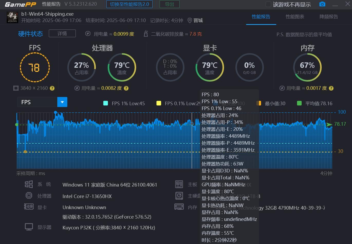 将分辨率设为为4K,使用预设高画质,平均帧率81。挺流畅了!