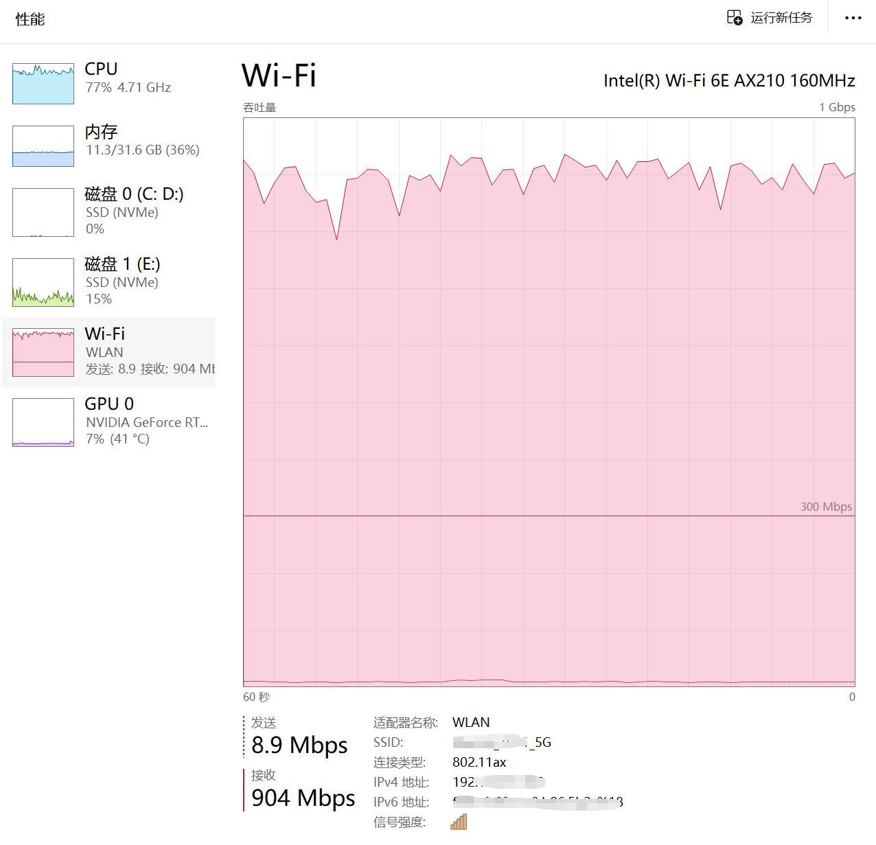机械师曙光S主板上装了一个Intel的AX210,支持WiFi 6E,性能很好且很稳定: