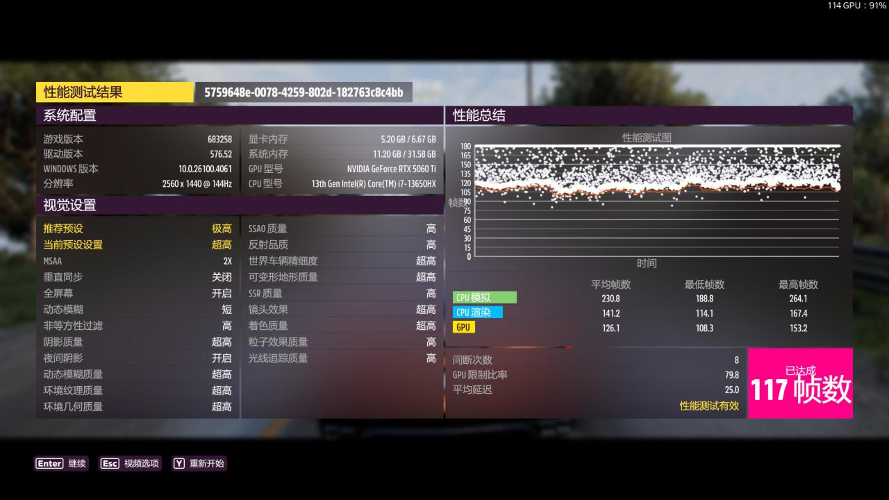 2K分辨率+预设超高画质,可以达成117帧的目标,GPU平均帧率126.1。