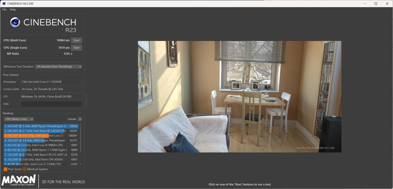 搭载13650HX的机械师曙光S,多核18084、单核1819的得分表现相当厉害: