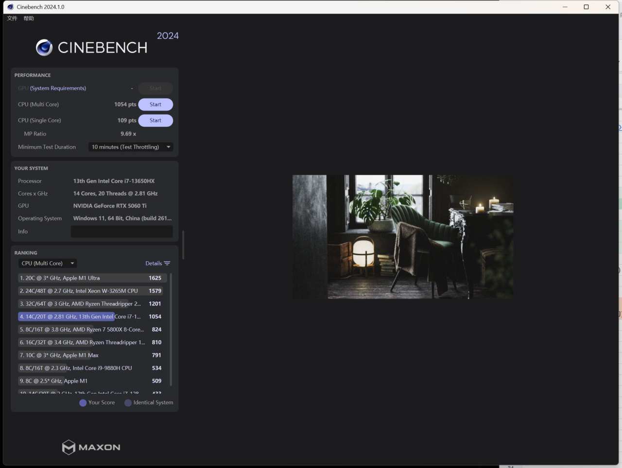 Cinebench 2024采用了全新的机制,机械师曙光S搭载的13650HX多核跑分1054,单核跑分109。