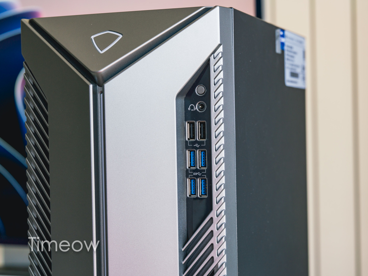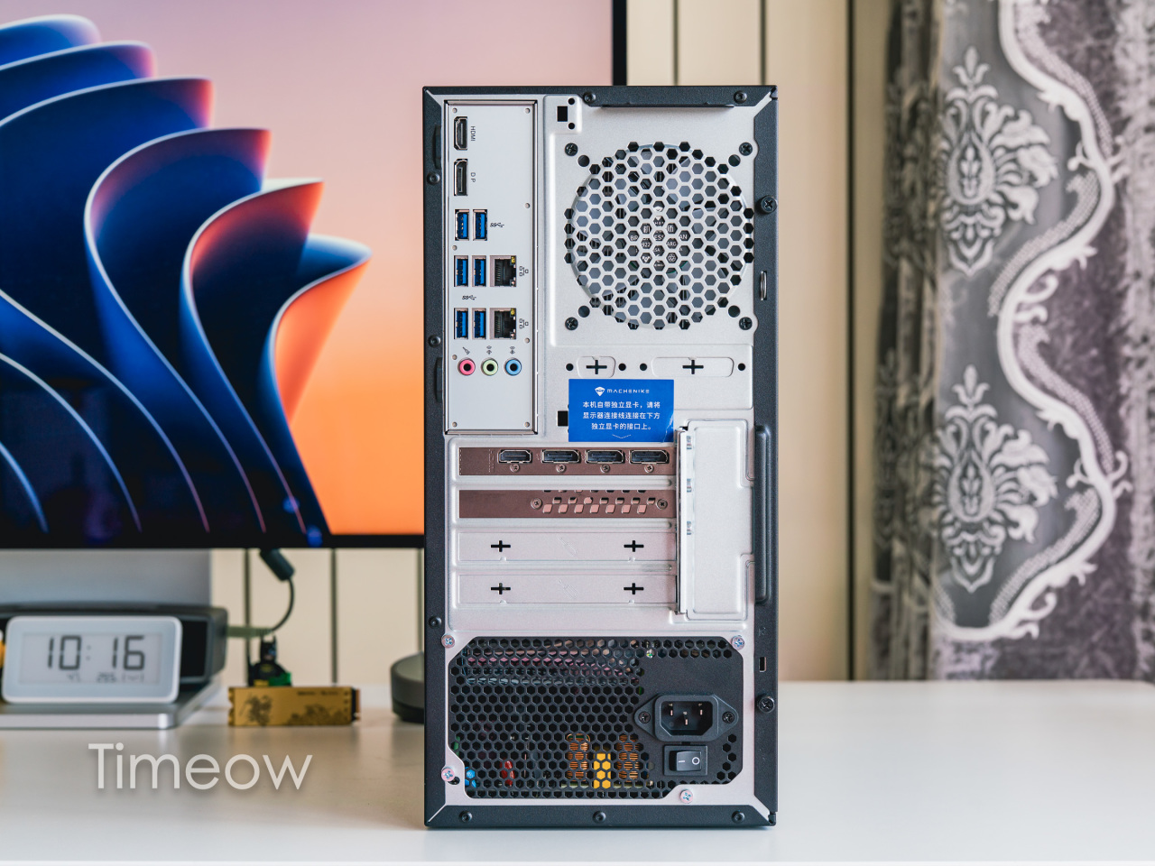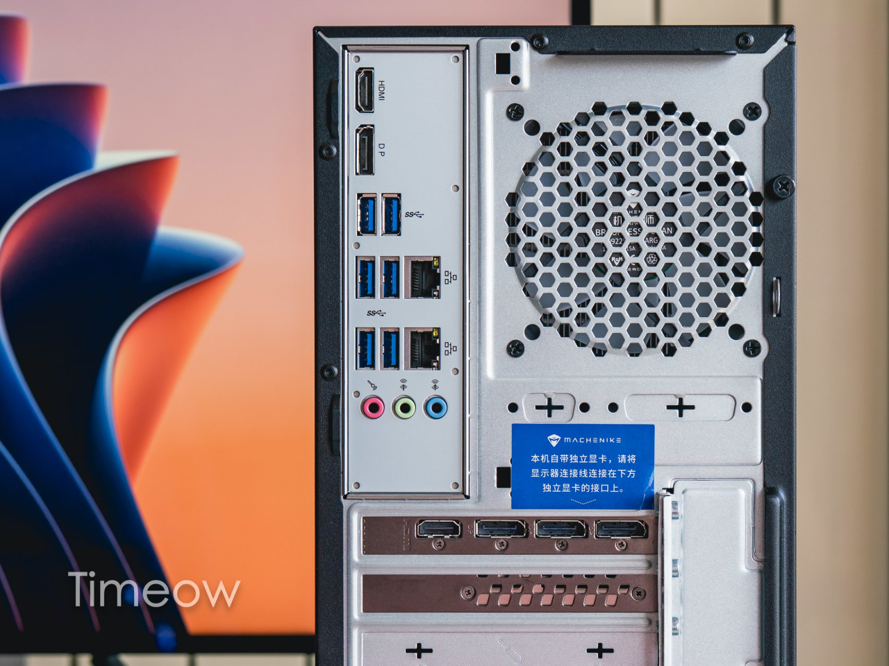 背部接口如上,USB接口同样有6个,不过其中包含规格和速率更高的USB3.2 Gen2 Type-A四个、USB3.2 Gen1 Type-A两个,接移动固态硬盘、硬盘阵列能有更好的性能表现。网口的话,机械师曙光S给了在品牌机里少有的双网口,一个1Gbps和一个2.5Gbps,连接内外双网、NAS/监控、搞软路由,玩法多多。