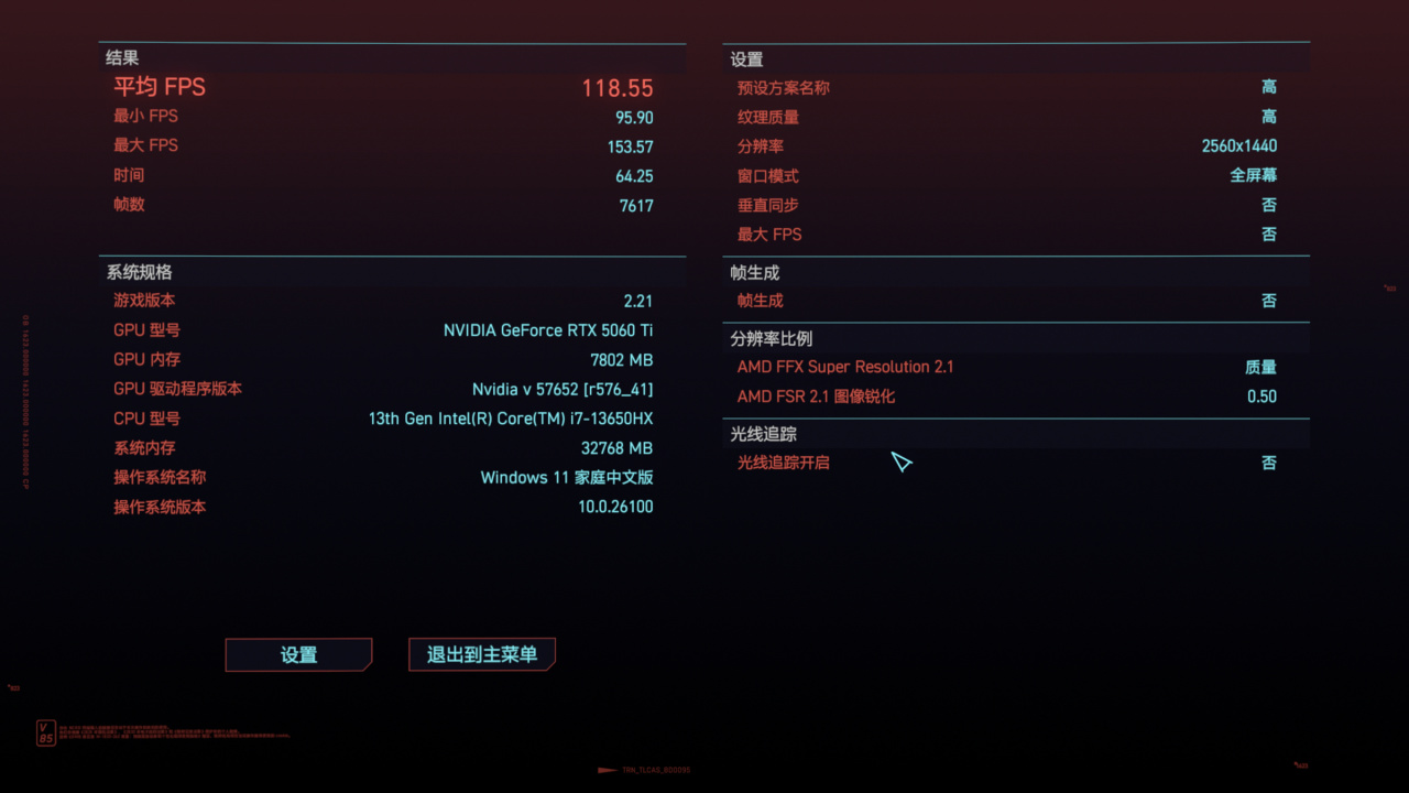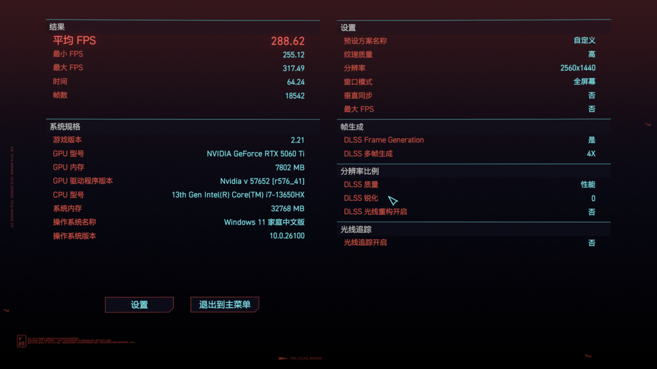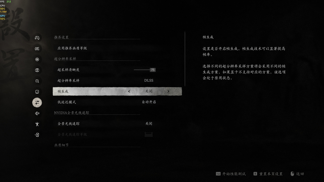 直接进游戏(benchmark工具不支持DLSS4),选择2K分辨率,应用推荐画质等级,超采自动调节到75,不开帧生成。