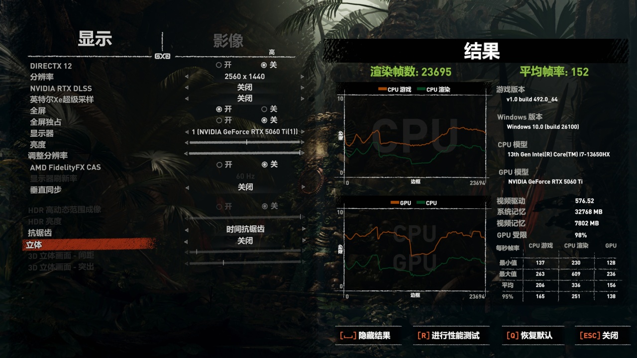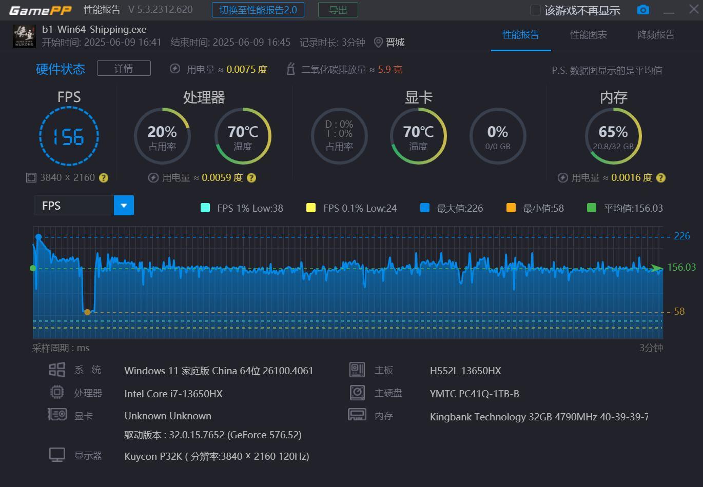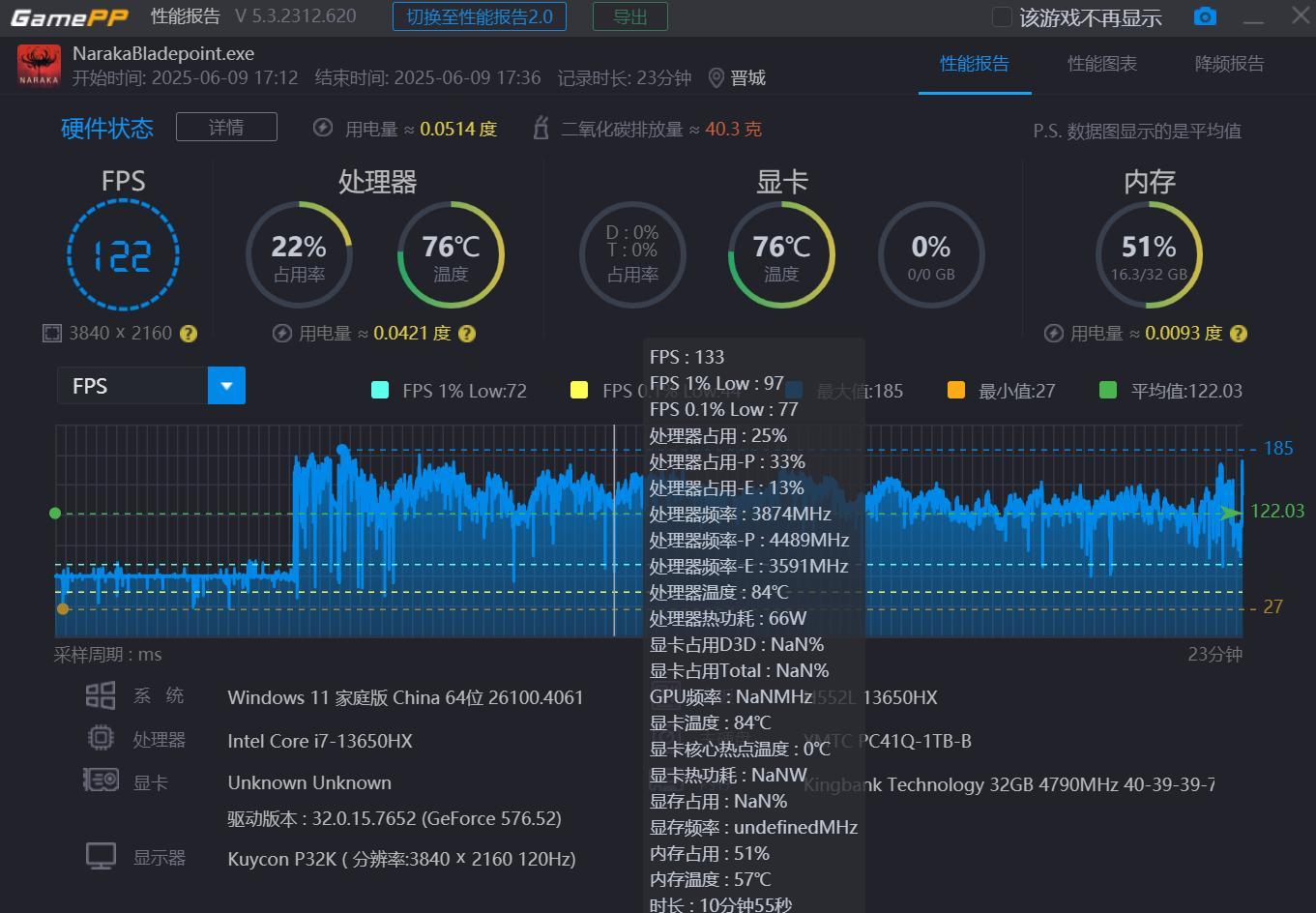 平均帧率122,而且这个数据还统计了大段登录菜单的60帧画面。20多分钟的实际游戏中,帧率可以达到140左右,low帧也都在40左右,丝滑度可以得到保证。