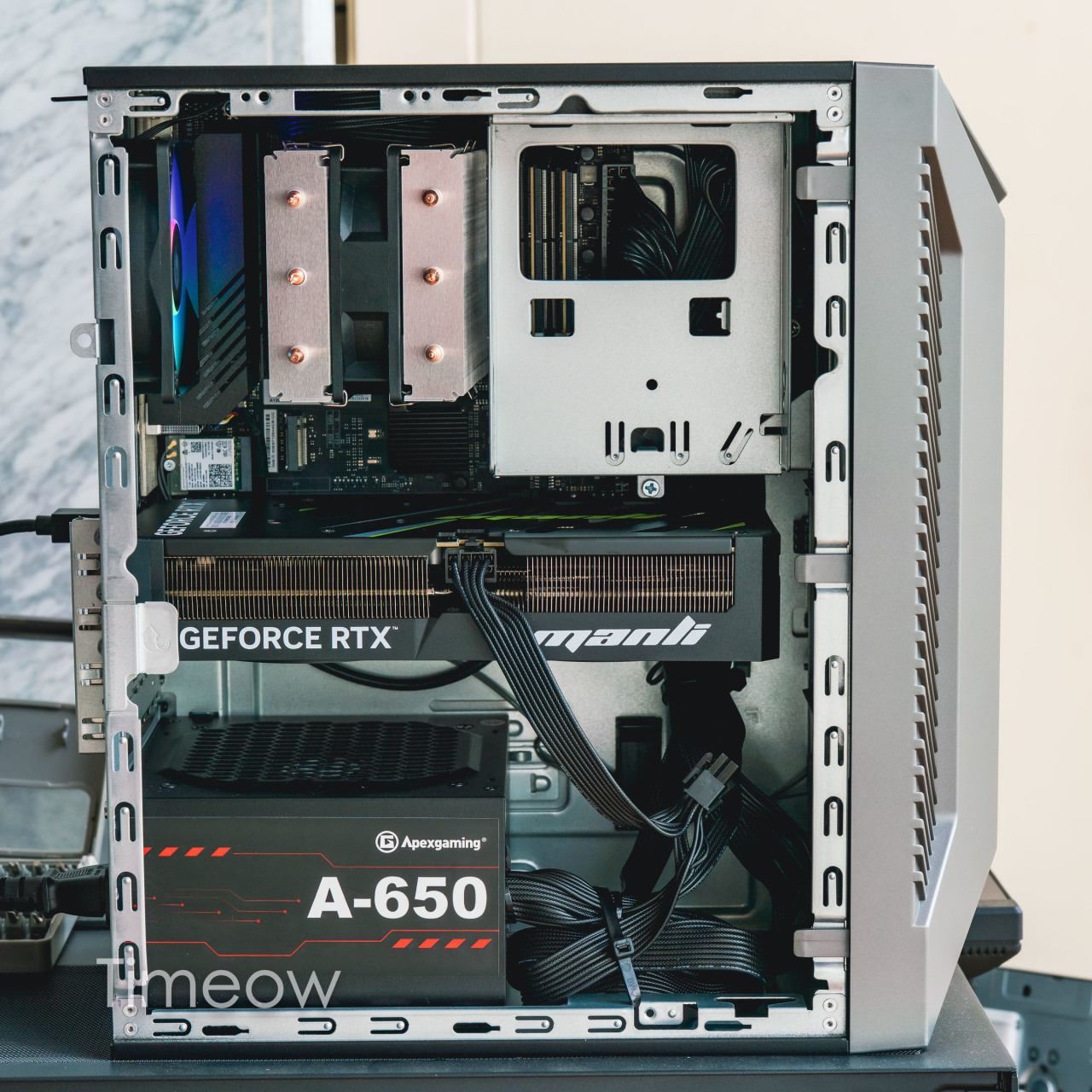 如果不是常规ATX电源的存在,我第一反应这是标准电脑的等比缩放版:小巧的CPU双塔散热器、小巧的风扇、小巧的的显卡。可惜显卡下方的空间利用率不高,如果能优化一下,就完美了。