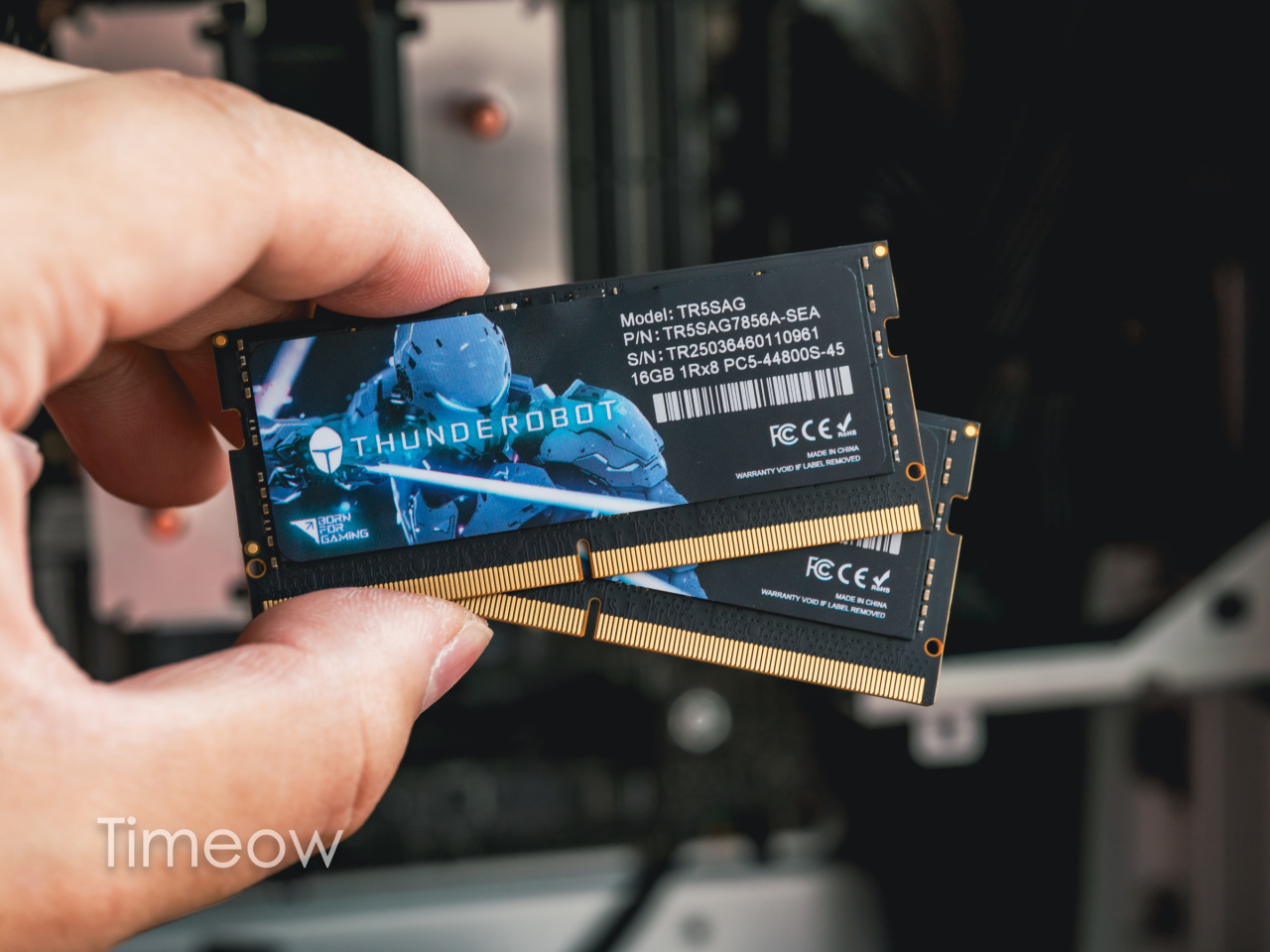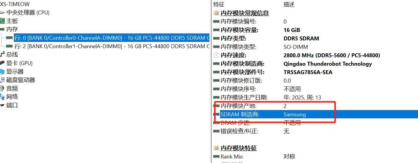 两根贴着雷神标贴的连号16GB的DDR5 5600内存,组成了稳定的32GB双通道内存。而连号则表明内存属于同一批次,体质更接近、性能更稳。