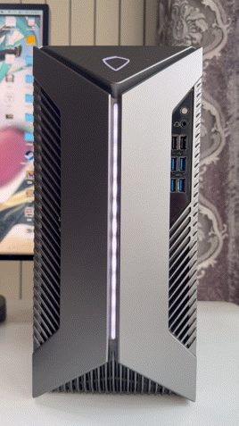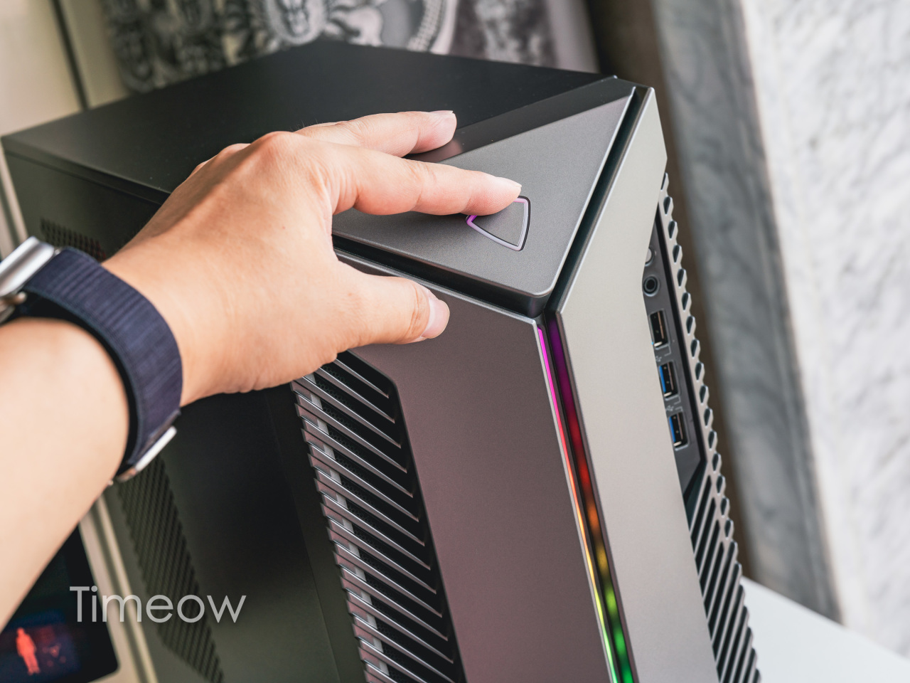 它的正面可以看做是由4个面组成,顶部有带灯的开机键、中间有一条RGB灯带元素,设计感满满。