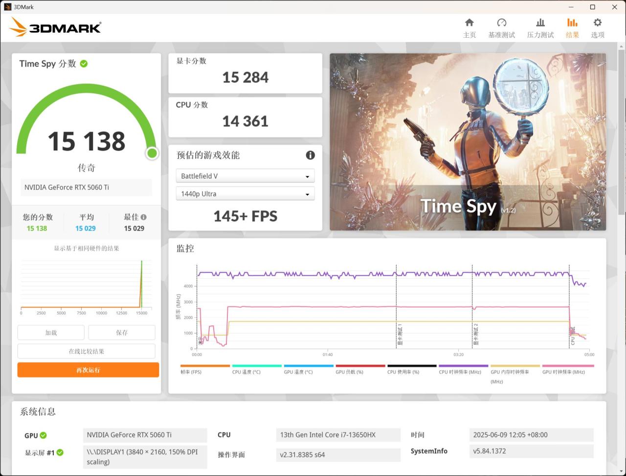 机械师曙光S在Time Spy测试中,综合得分15138,显卡得分15284。