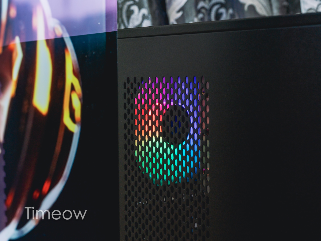 机箱侧板也做了镂空处理,直接进气让CPU散热器散热,而且还能看见机箱风扇的RGB灯。