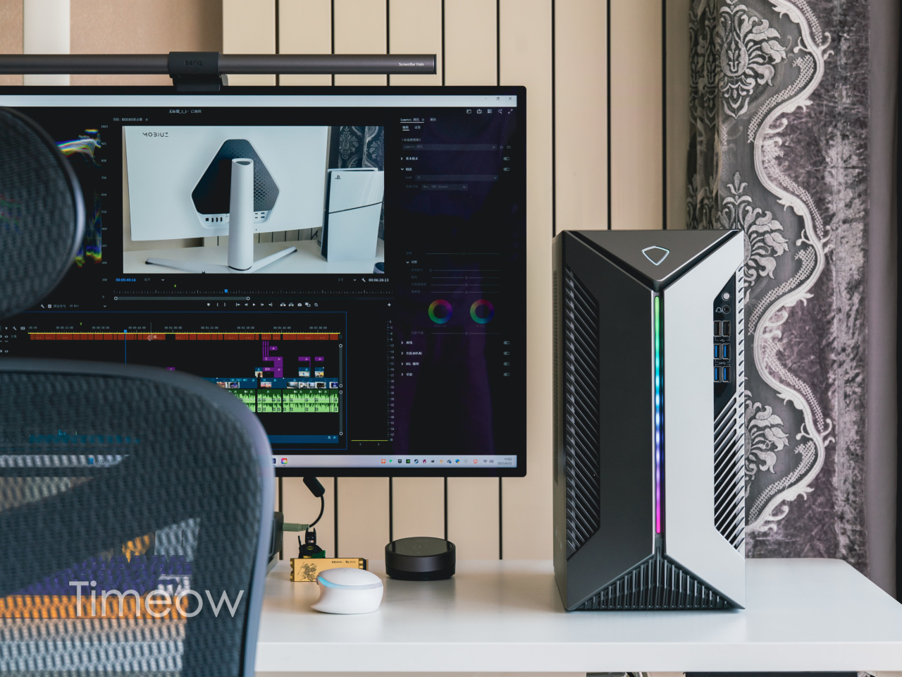 以前我用的傻大黑粗的台式机,放桌子会遮挡阳光,现在这个小机器没有那么压抑了,与显示器摆一起挺和谐,桌面也显得更清爽了。