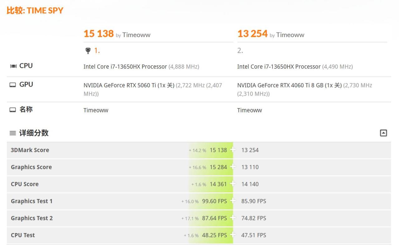 对比13650HX+4060Ti的机型,提升也是全方位的【有所提升】。