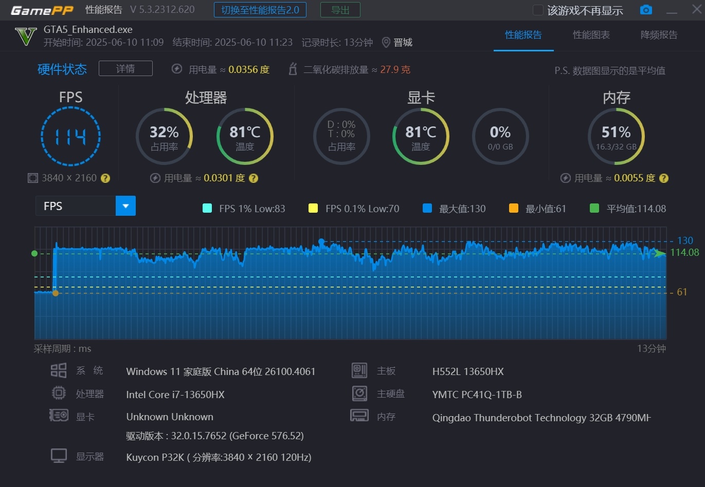 4K分辨率+预设高光线追踪下(非常高的画质等级),在在线模式中平均帧可以达到114,1%low帧也都有83,整体体验相当丝滑,几乎没有卡顿。