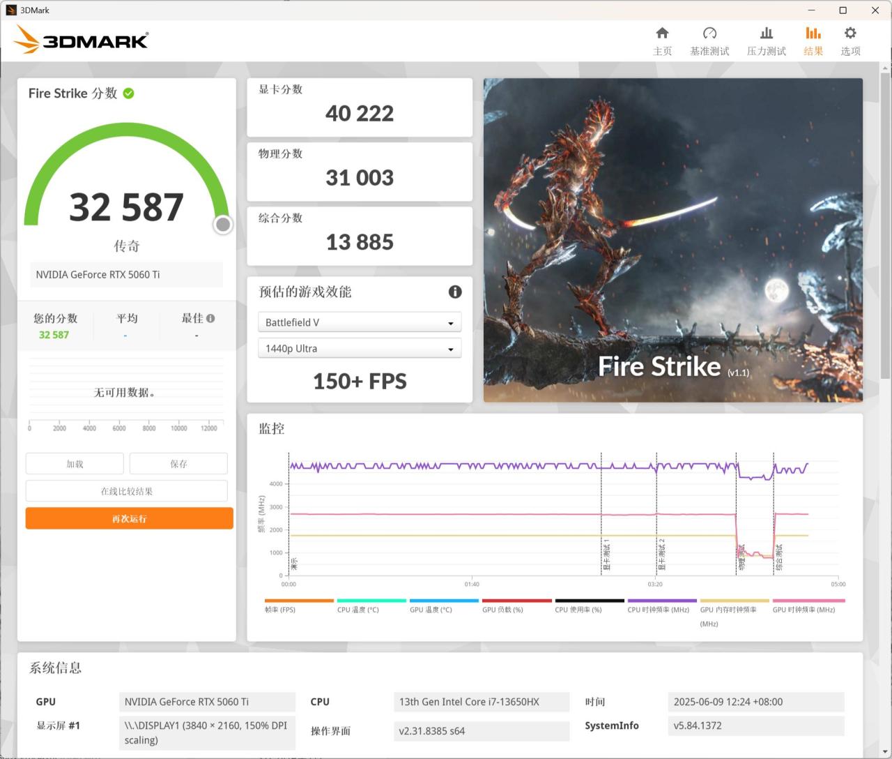 机械师曙光S在Fire Strike测试中,综合得分32587,显卡得分40222。
