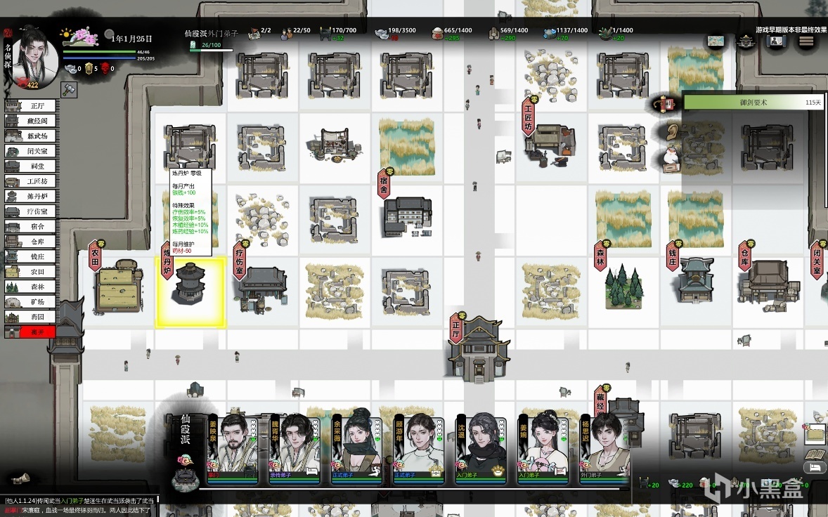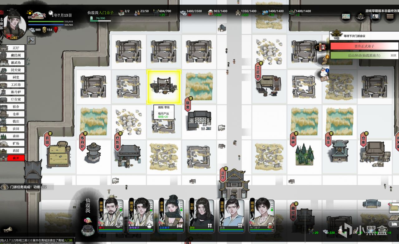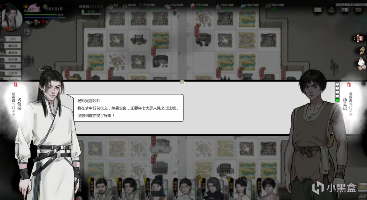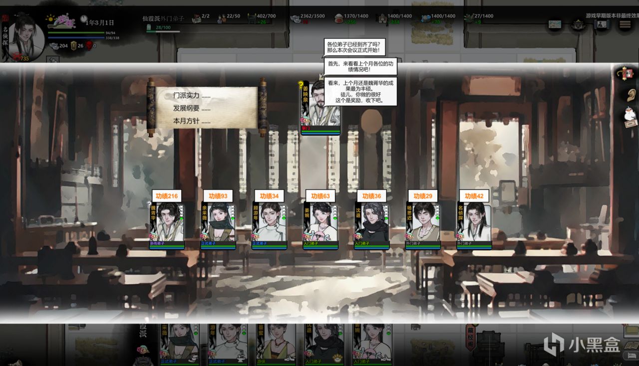 门派的各种参数,比如弟子数,银两,食材,木材这些资源都显示在了屏幕的正上方,这些本应该属于SLG游戏里的策略性内容,居然会出现在一款武侠游戏里。