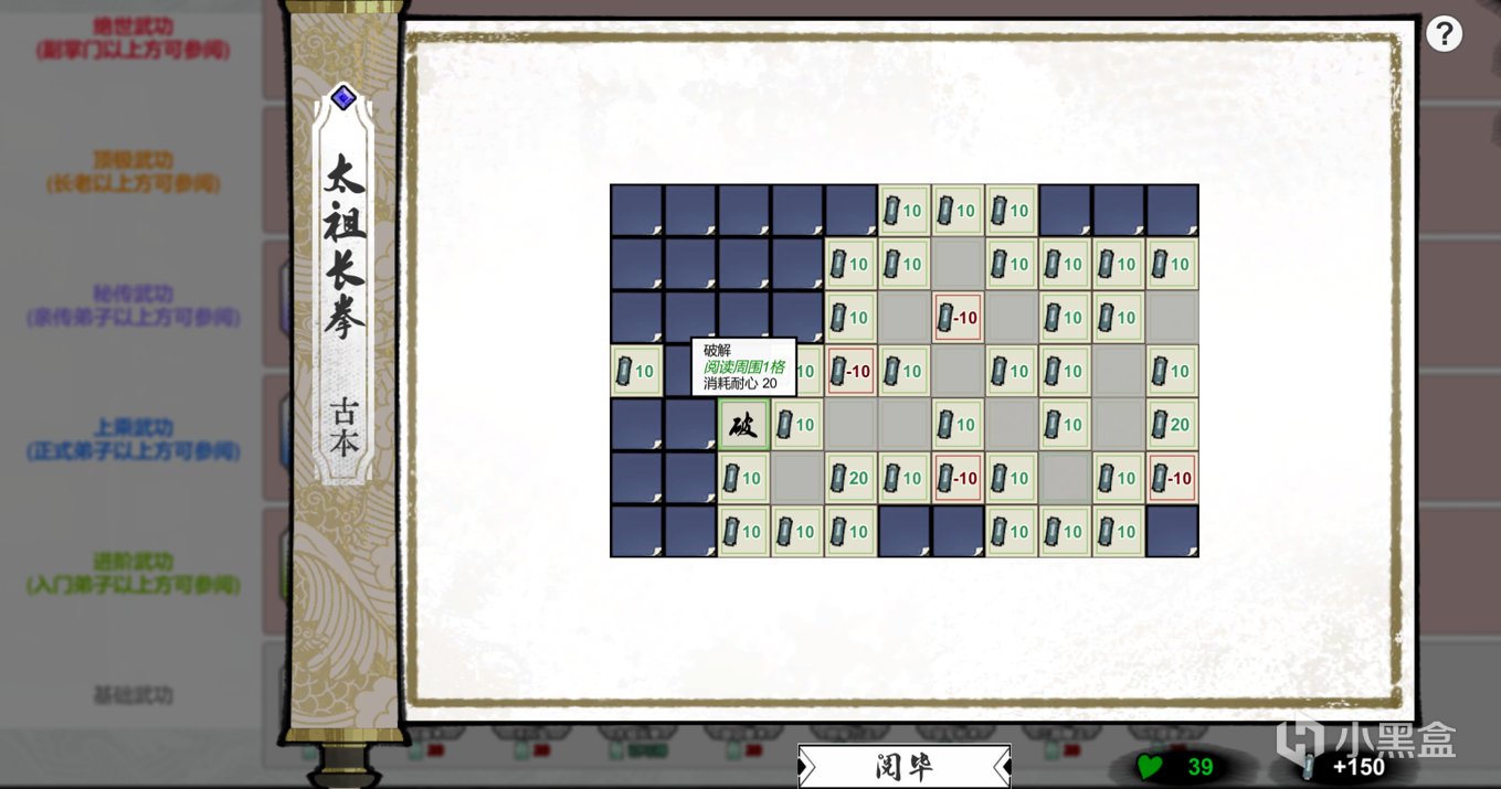 不得不说,《龙胤立志传》很有创意的把各种练功的过程都做成了小游戏,比如在翻阅秘籍的时候,就可以像玩扫雷一样,用精力去开启格子,收集参悟点,直接赢在起跑线上。