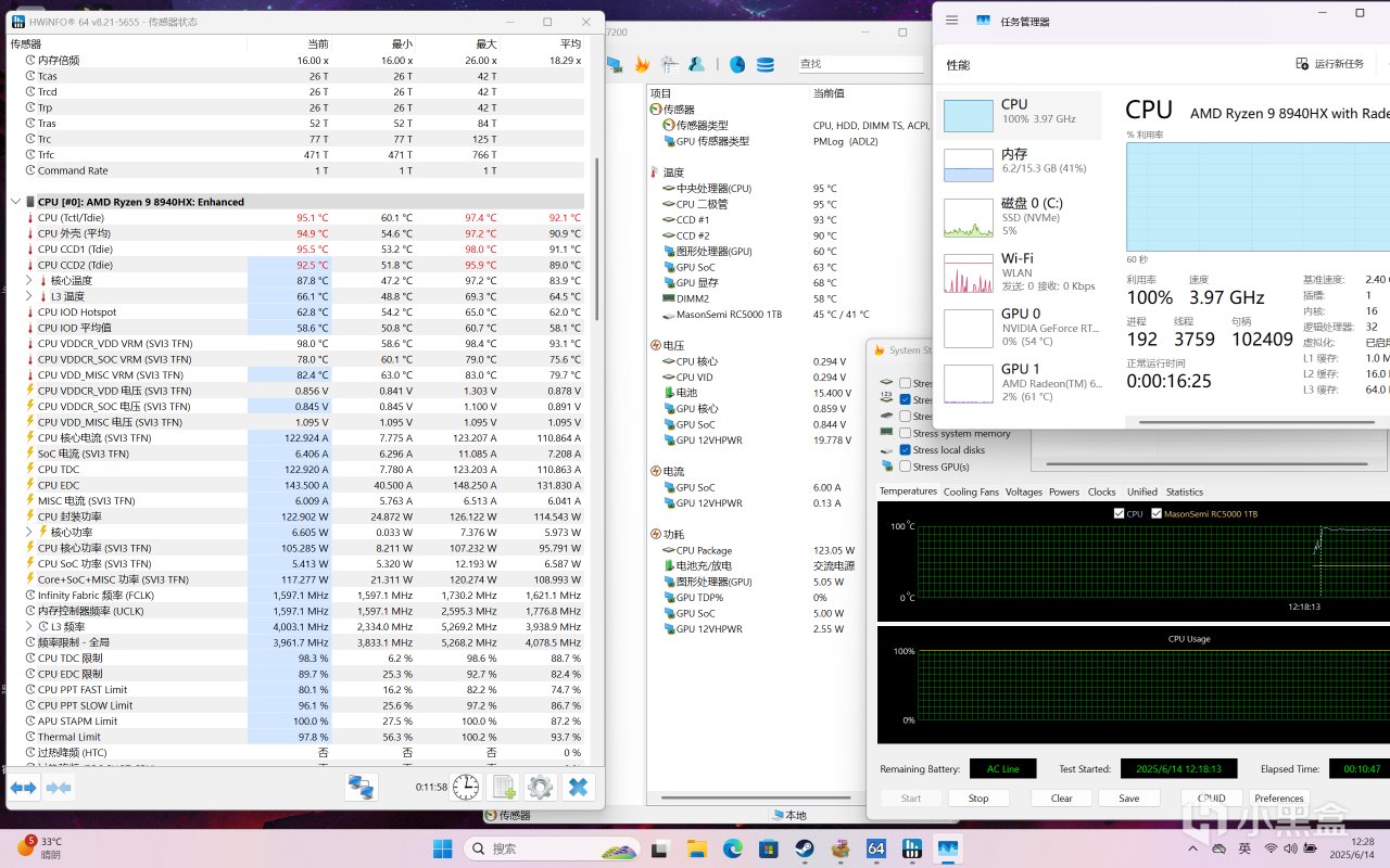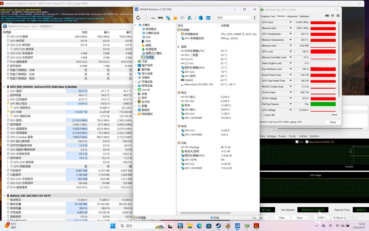 双烤的话,在斗战模式(最高一档),独显直连的情况下,可以做到86+114W上线,显卡几乎可以一直顶着114W之上接近115W的功耗墙在跑,整机200W的性能释放,官方宣传的还是没有水分的,散热这块机器调确实在主流水准之上: