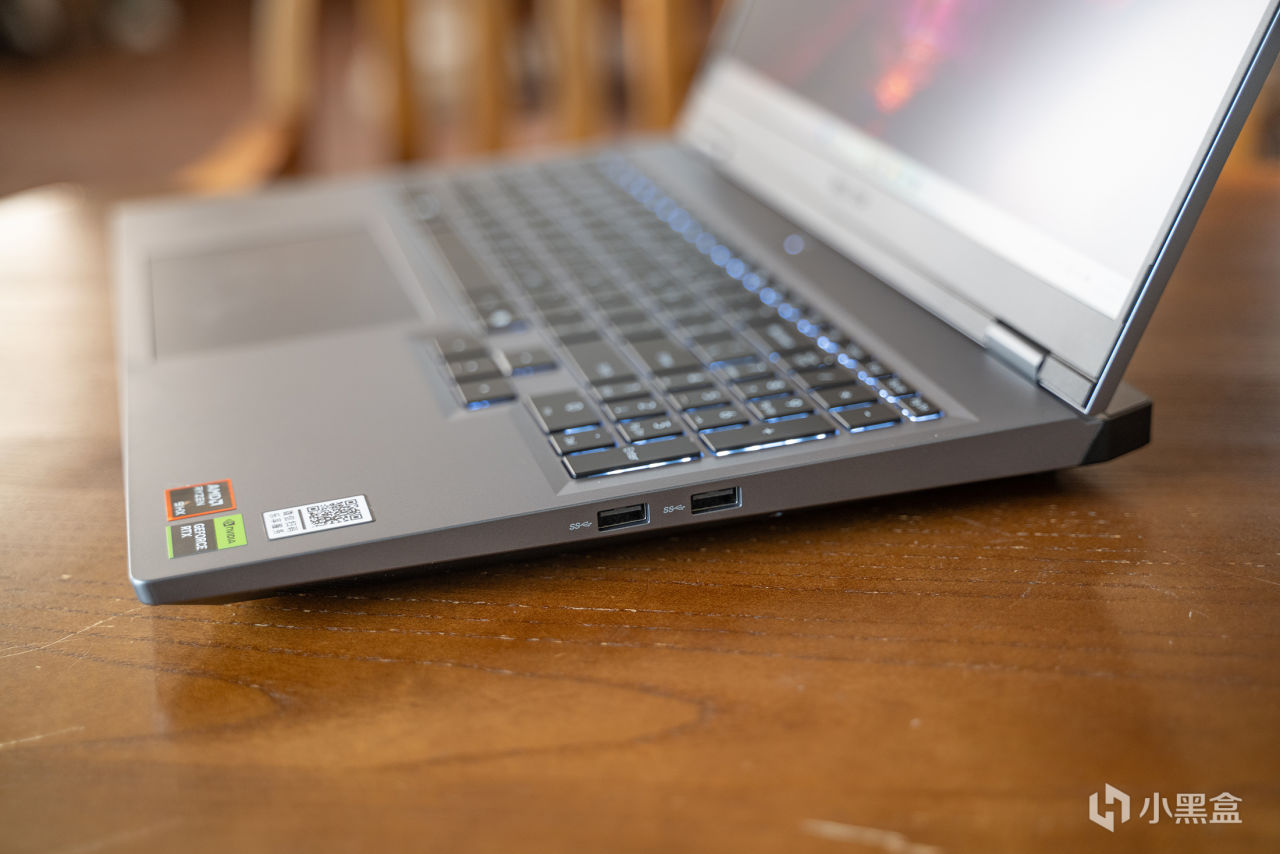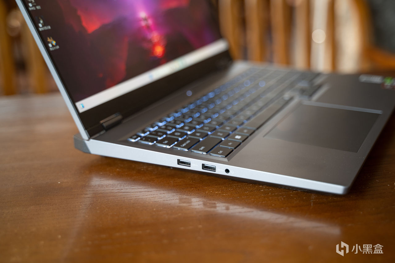 结合上方尾部出风口上的电源接口,USB-C 10Gbps, HDMI2.1和 RJ45,机器一共是4A+1C+HDMI的设计,其中C口支持dGPU DP 1.4 + 100W PD 3.0,整体接口规格够用,4个常用的A口被放在了两侧,方便外接一些外设或者移动存储之类的,日常大多数情况下都够用了。