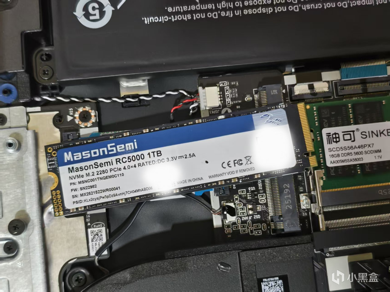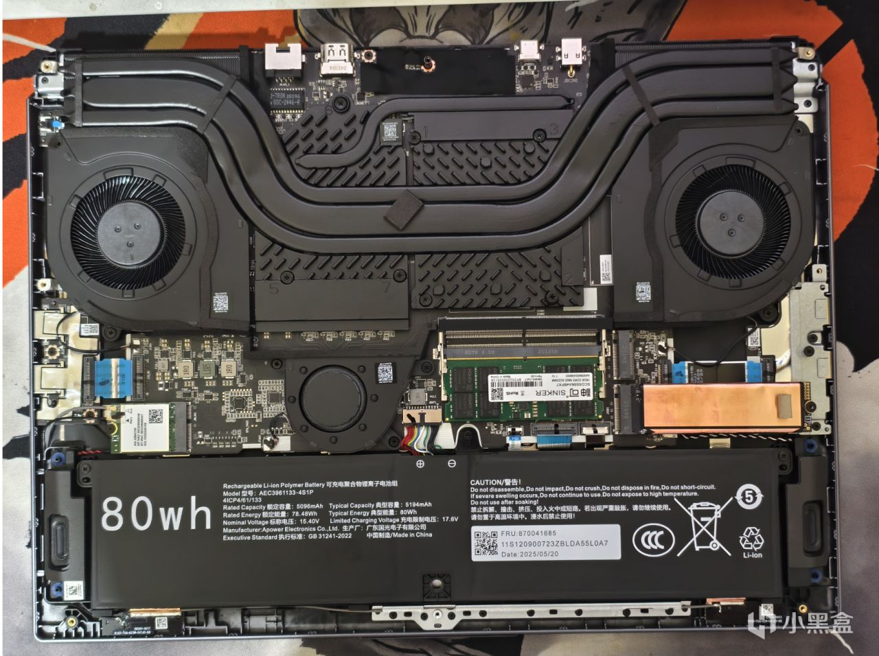 从拆机图来看一下散热,机器采用了3风扇4热管的内吹散热结构,主风扇将大部分热源从后侧出风口吹出,中央小风扇可以辅助排出中央区域的积热,这个散热规格也是这台机器真正核心的部分,核心部分的CPU+GPU+散热模组三大件没有缩水,提供了同价位越级性能表现:机器内部结构布局也比较简单,硬盘和内存的位置一眼可见,方便加装扩展: