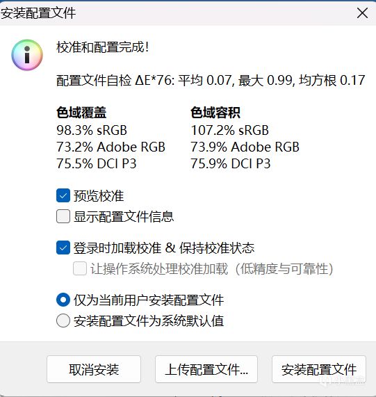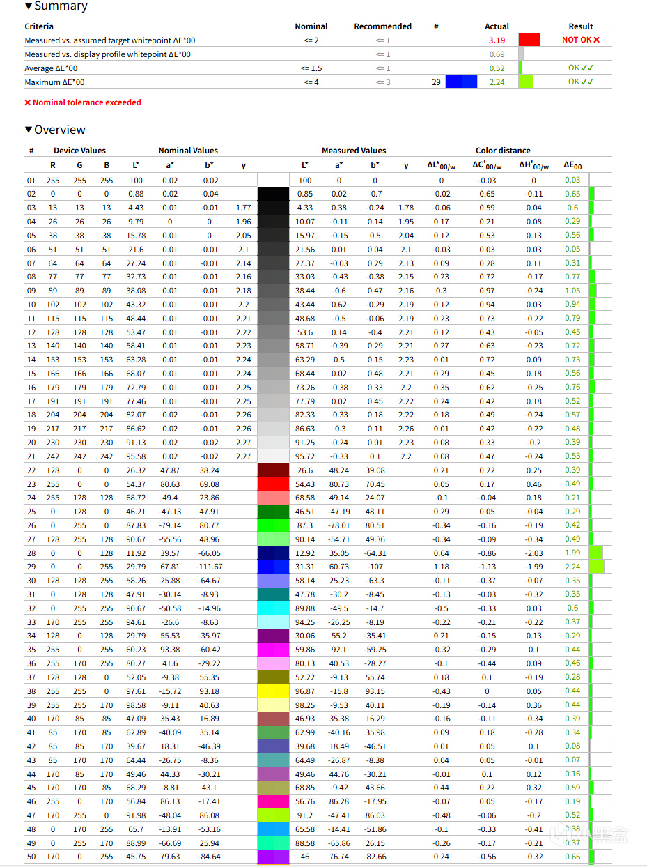 校准后平均ΔE为0.52最大2.24,蓝色偏的有点多其他方面色准问题不大甚至属于比较好的水平: