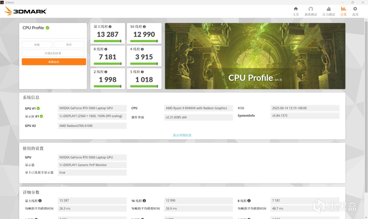 核心配置上给到了AMD锐龙 R9-8940HX,为7000系HX的Refresh版本,拥有16核32线程的全大核设计,基准频率2.4GHz最大可达5.3GHz,也是这个价位的游戏本比较普遍的配置,和8945HX就差了0.1GHz的主频日常基本感知不到,这点不用太纠结,实测这颗CPU在3D MARK的CPU Profile中跑出13287的最大线程,对比R9000P上的8945HX基本没啥差别,但那玩意可就贵了,多线程比14900HX要强一些,单线程弱一点,AMD老传统了: