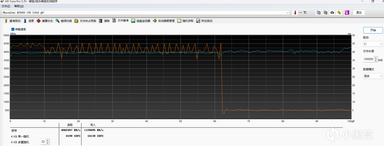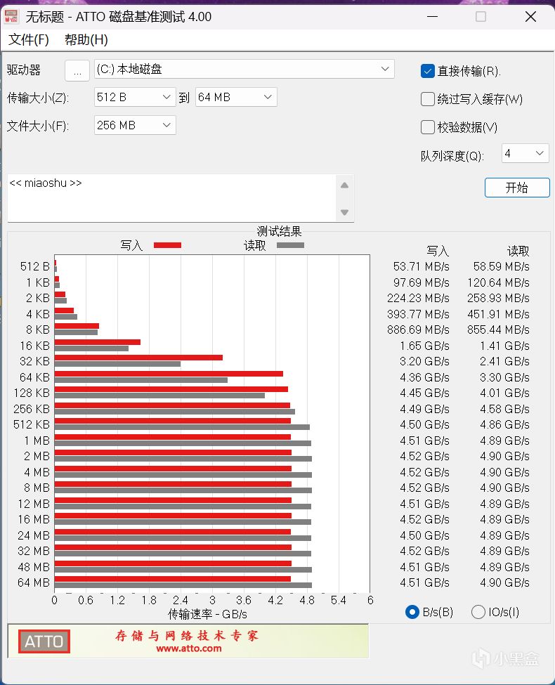 比较意外的是小文件的读写倒是表现不错,512kb之后就比较平均了,写入在4.5G上下,读取4.9G: