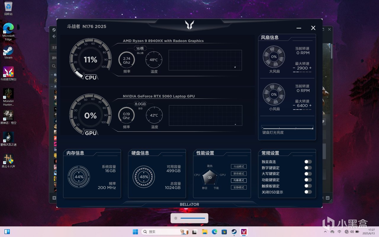 另外,斗战者的控制中心本来以为是照搬拯救者的过来换个皮,没想到是整了个全新的,机器预装软件倒是十分干净,除了这个斗战者控制中心外再无其他软件,这点好评,目前可以显示CPU和GPU的负载,风扇转速等信息,以及切换性能模式和独显直连,该有的功能都有了,但是目前还是有点简洁了,可玩性不高,如果这机器后边还有并且能自成生态的话,可以期待一下后续开发更多功能: