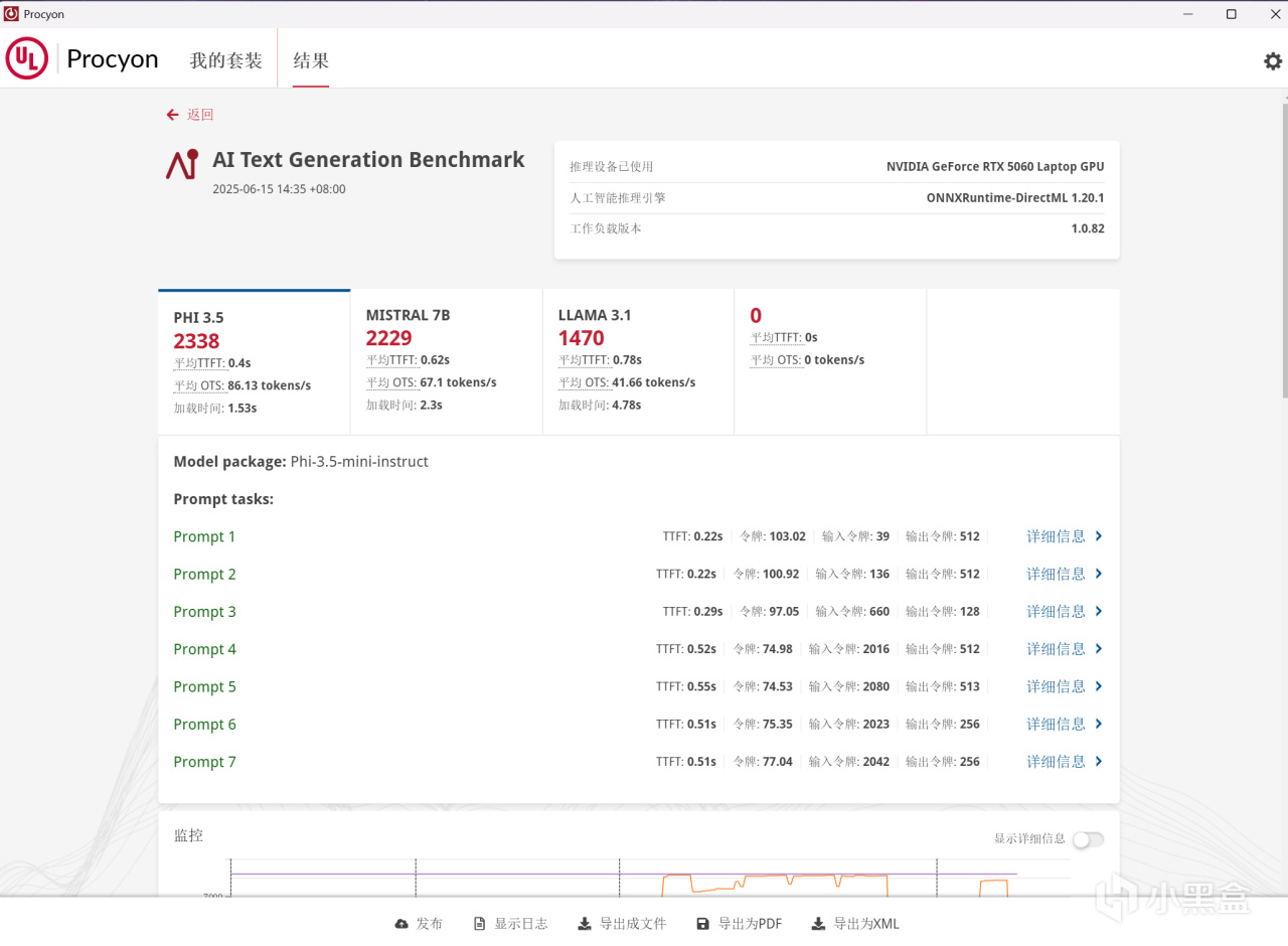 AI算力方面,RTX5060拥有573 TOPs的AI算力以及8G显存,使用Procyon自带的 AI Text Generation Benchmark来跑个分,这项测试旨在测试机器运行本地语言模型的推理性能,他会测试phi-3.5-mini, Mistral 7B ,Llama-3.1-8B, 以及Llama-2-13B四个大模型的工作负载,前三个问题都不大,Llama-2-13B没分,8G显存跑不了,稍大一些的模型还是建议使用显存更高的显卡以及大内存: