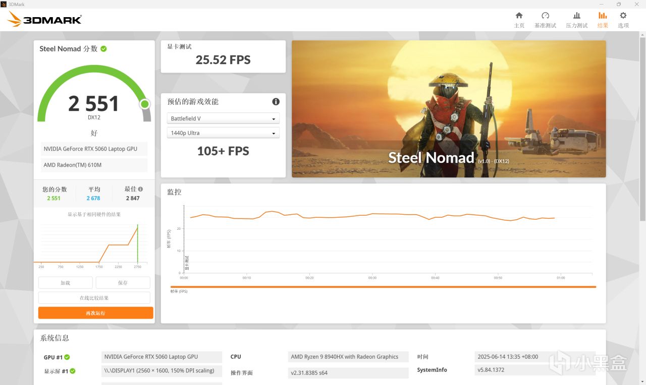 Steel Nomad分数为2551,符合5060的主流水平,总体性能相比4060提高了10%左右,但是因为5060支持DLSS4,实际表现感受上还是好一些,这个咱们下文再说。
