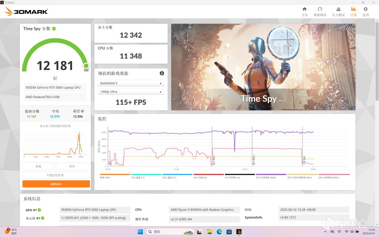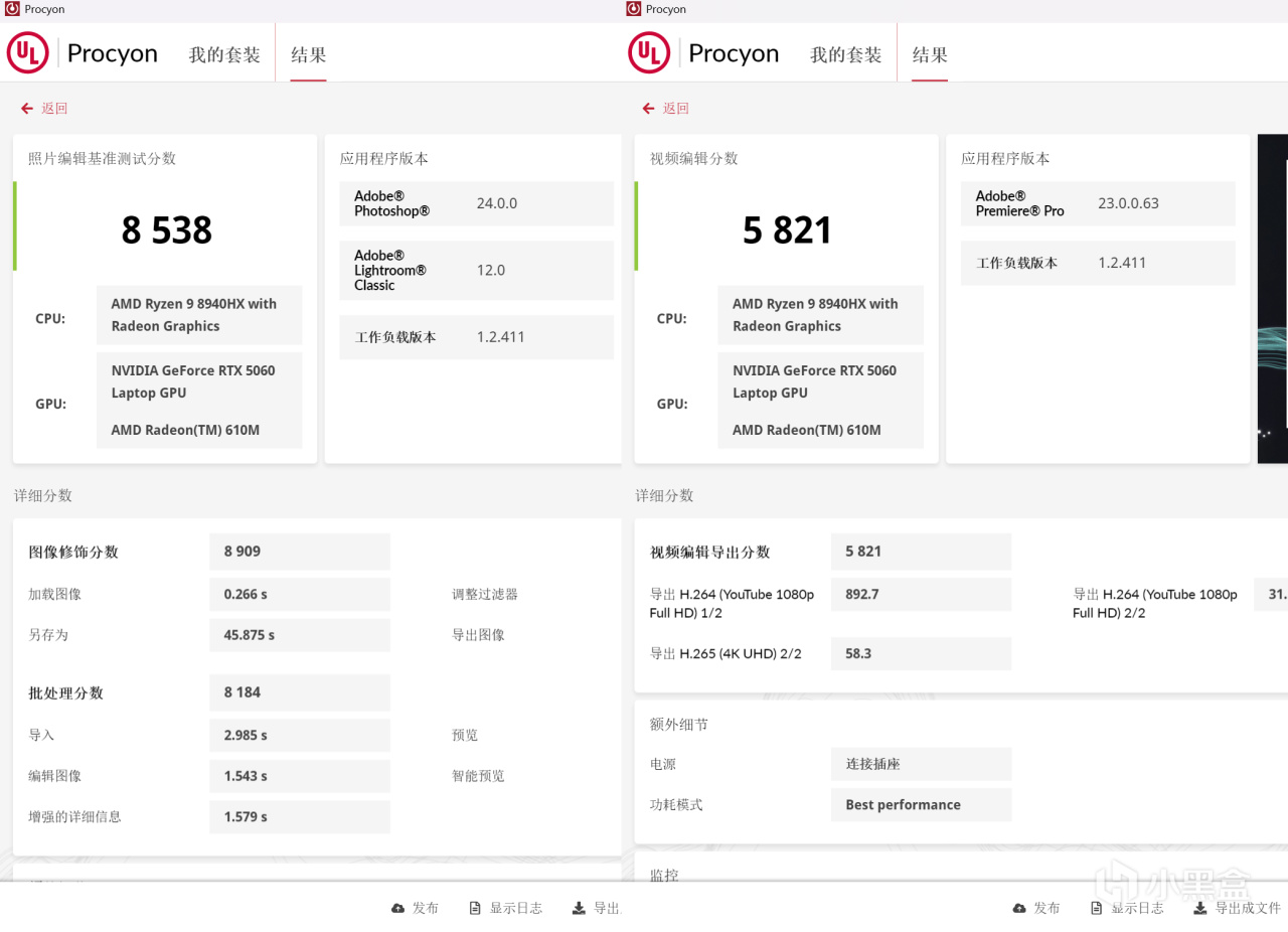 首先还是是数字媒体生产力相关的内容,采用Procyon自带的基准测试套件分别测试处理照片和视频编辑性能,这一块生产力内容CPU的参与度比较大,日常用来编辑个照片,处理网图以及剪个vlog没啥问题,5060的独显算力跑现在PS里边的各种神经滤镜也是足够的,作为自媒体或者数字媒体工作者的移动工作电脑也问题不大: