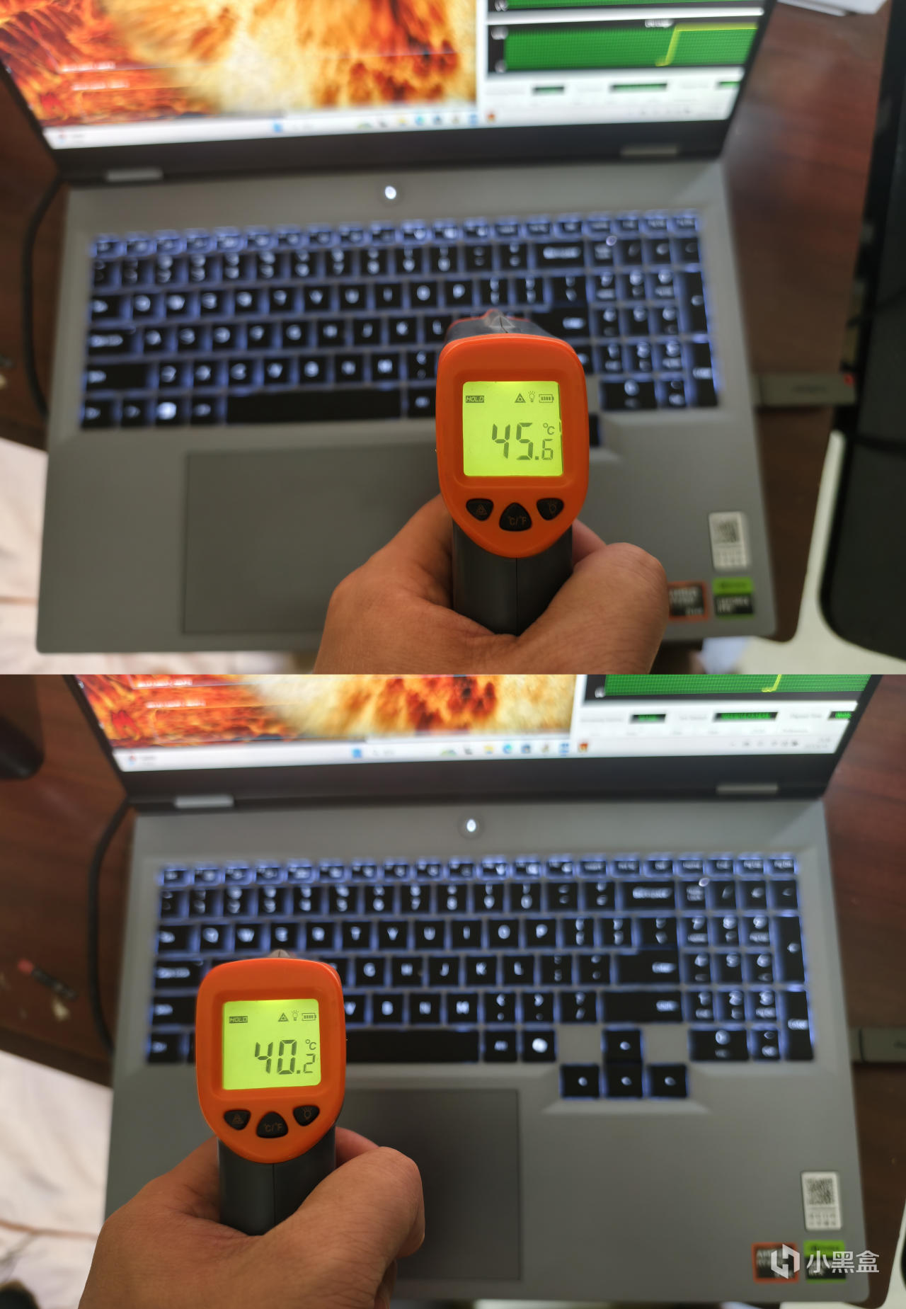 这一模式下表面温度集中在键盘右侧靠中间的位置,最高在45°上下,WSAD区域的温度在40°上下,测试时室温27°,左侧温度控制的还可以长期打游戏不至于难受,右侧没有出风口对拿鼠标的手也比较友好: