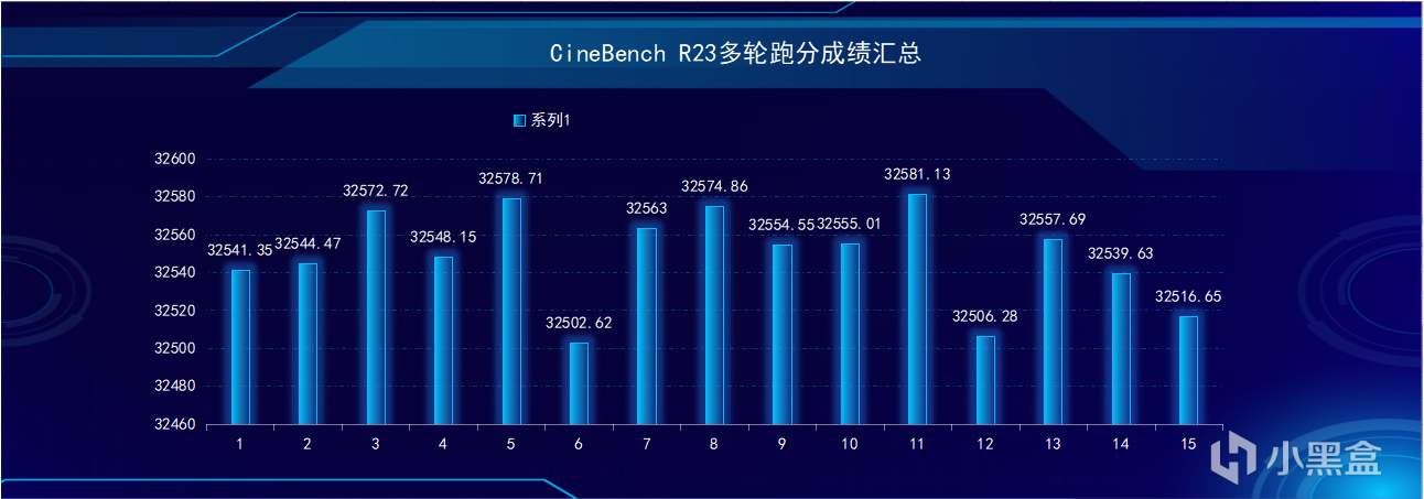 运行15轮CineBench R23多核测试的跑分结果基本都在32500往上,调的还是比较鸡血的: