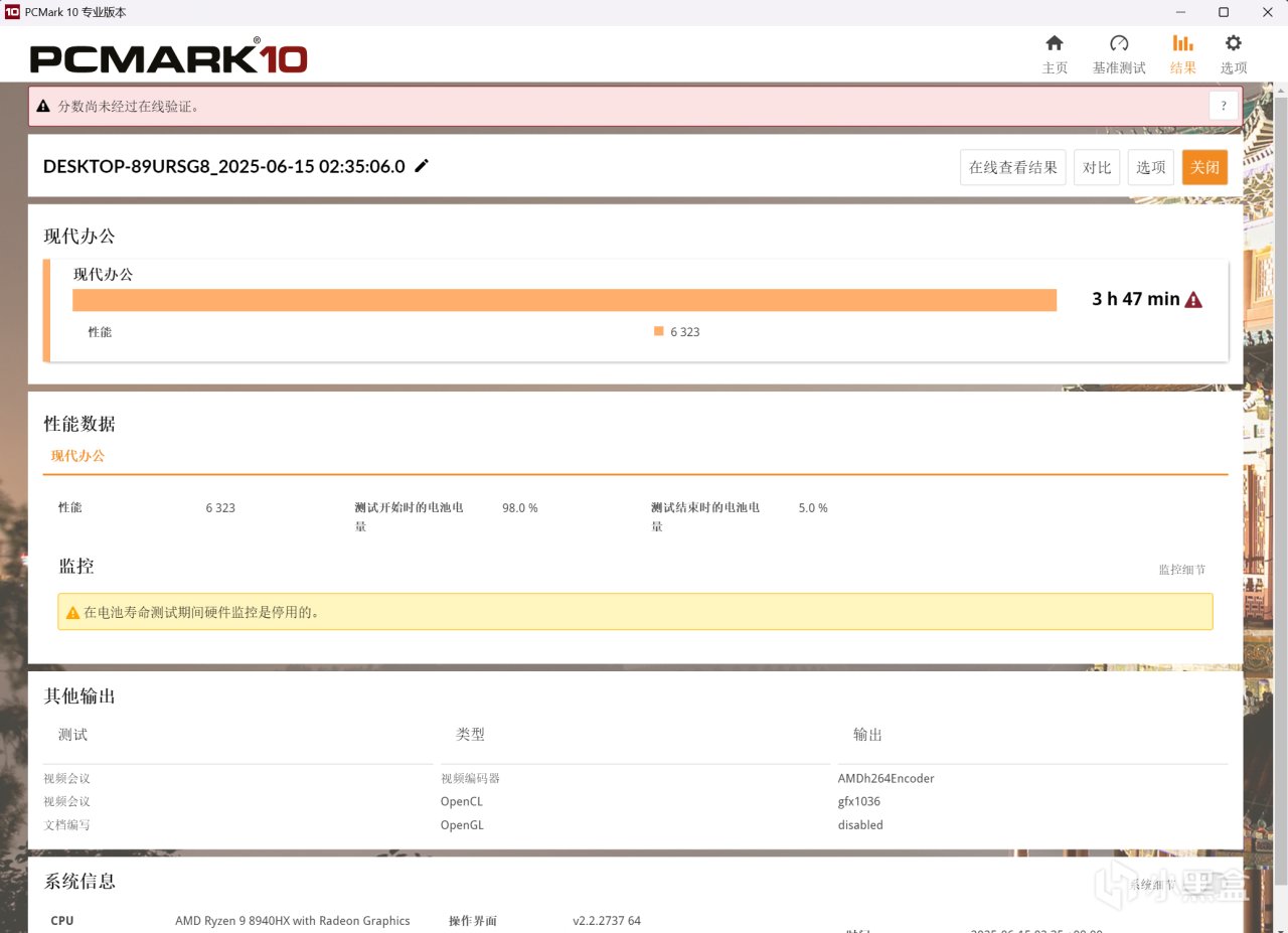 游戏本嘛测个参考值,大家看看就好,本身就是游戏本AMD的离电能耗感人,在PC MARK10的现代办公测试下 ,安静模式,屏幕50%亮度98%的电量跑了3h47min: