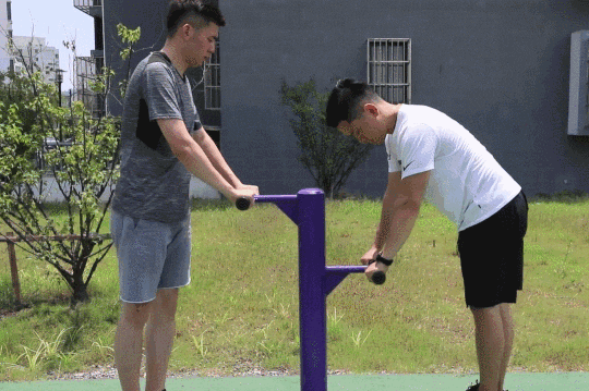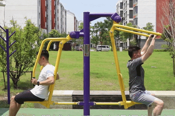 坐在座板上,双手握住扶手,靠自身力量,两者相互上下运动。