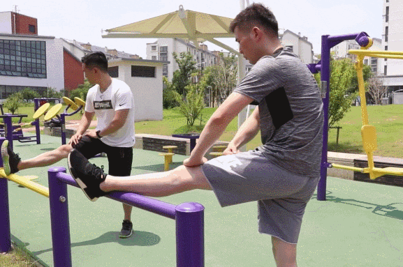 单脚站立在地面上,单腿搁在横杆上,腿部用力,身体向前倾,慢慢向腿部靠拢,不断重复。