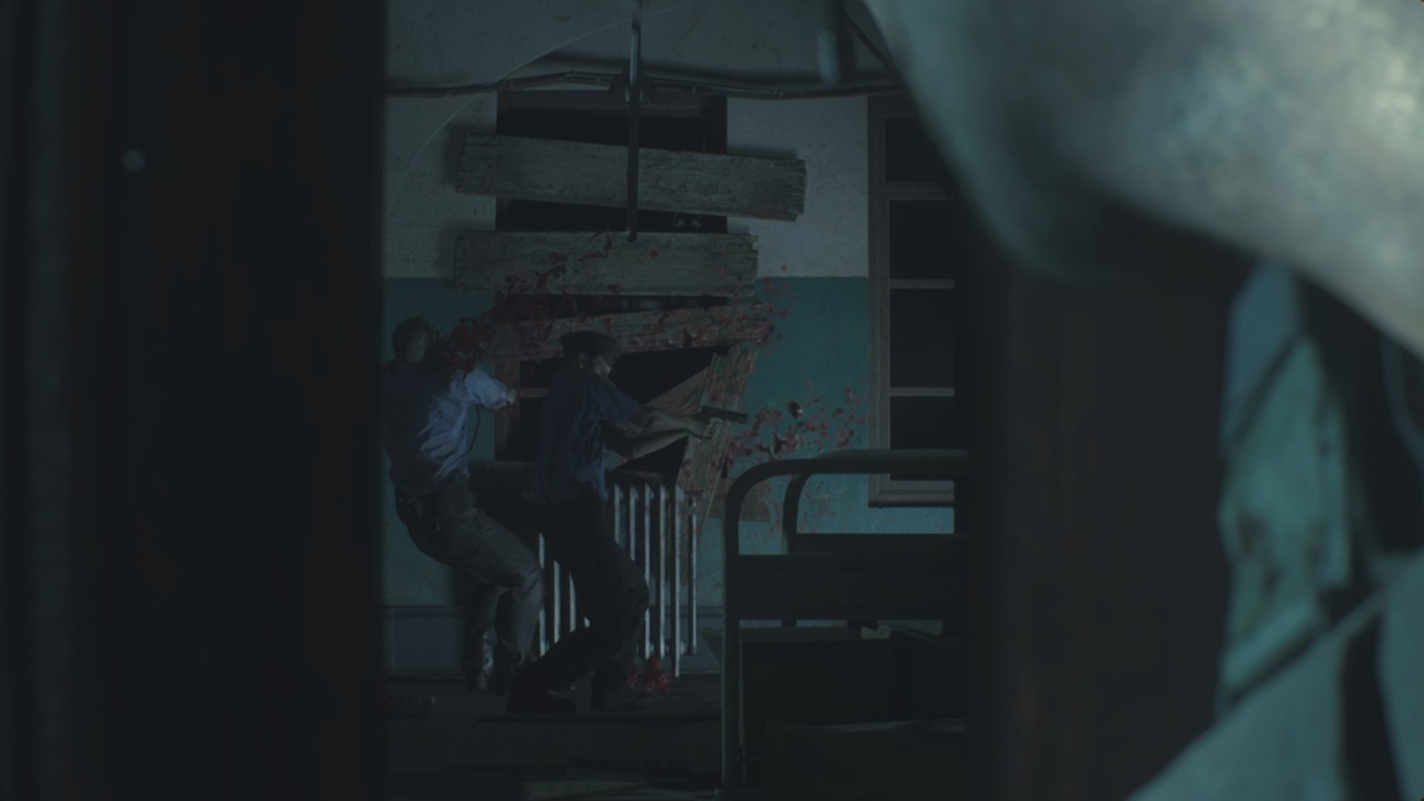 此外,还有解释马文为什么感染(被丧尸布拉德咬);里昂到浴室时为什么有蒸汽得找阀门关闭,墙上还有个大洞(卡洛斯炸的),以及一楼转角处被舔食者杀死的两名警察