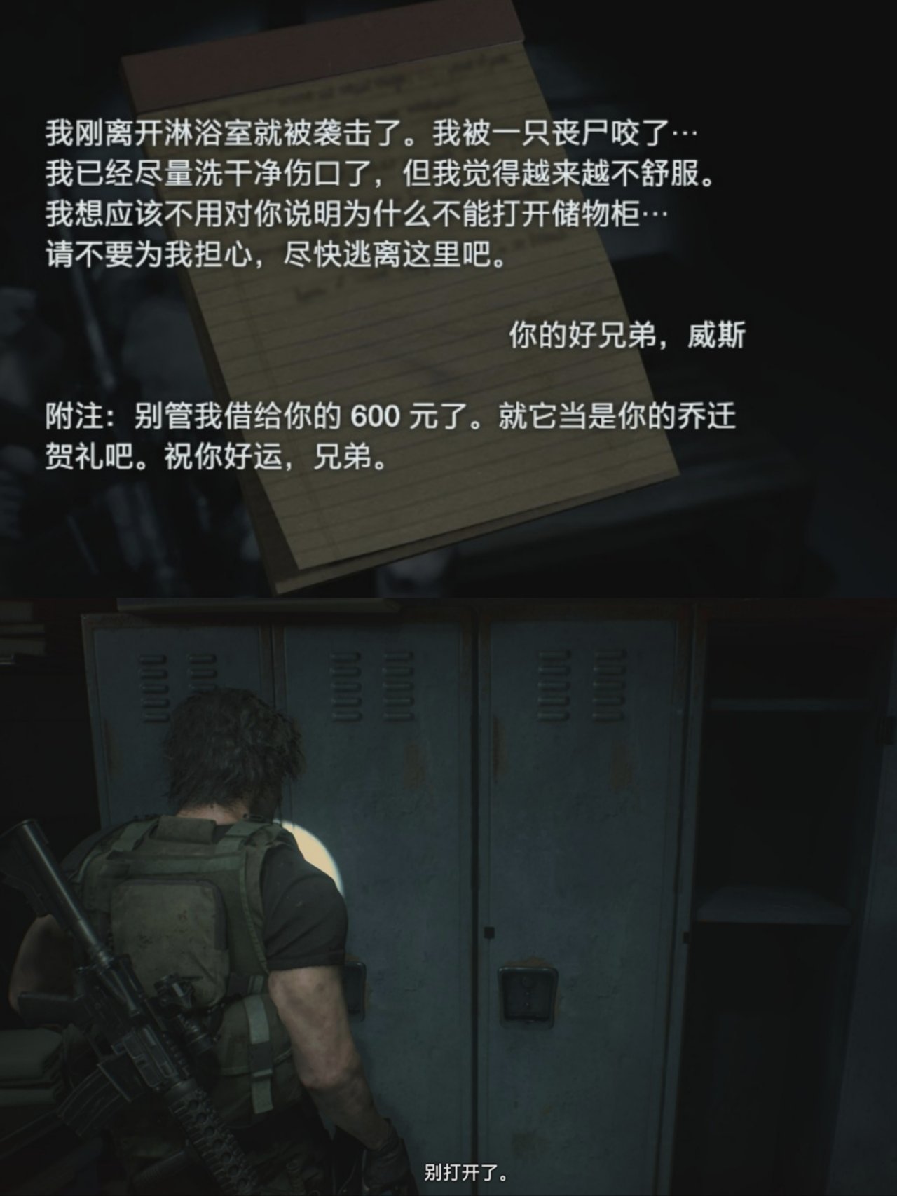 在某处凳子上可以看到封遗书,上面提示前方柜子里有丧尸,卡洛斯在和这个柜子互动时会说“别打开了”