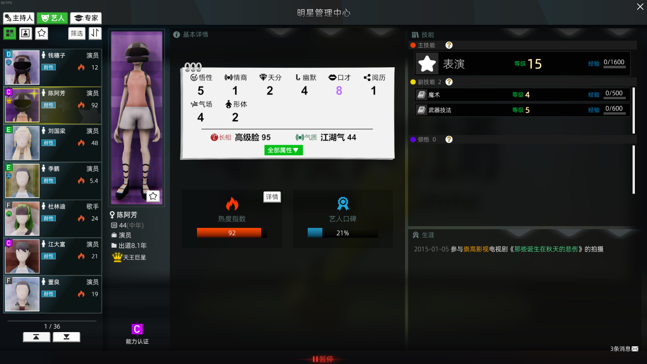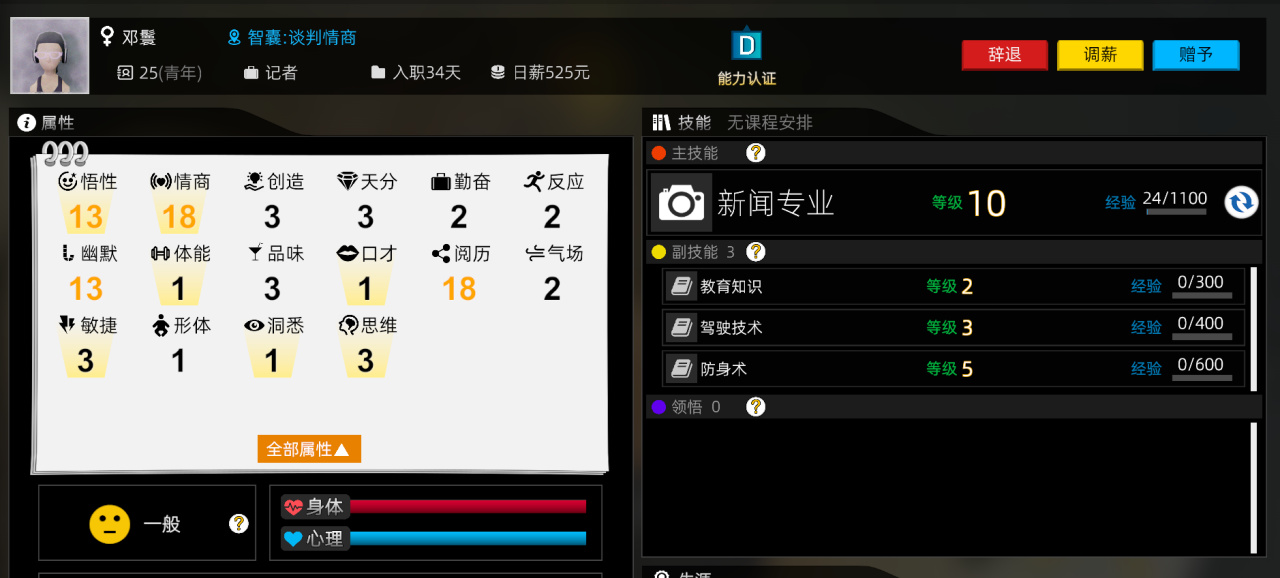 除了主技能外,工商管理(當管理層)、美食知識(拍美食節目)、遊戲知識(拍電競節目)等細化副技能在特定情況發揮着作用。