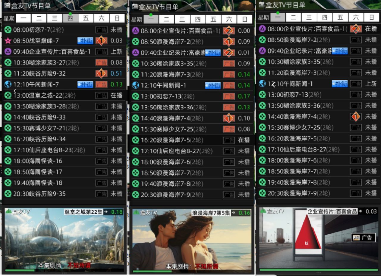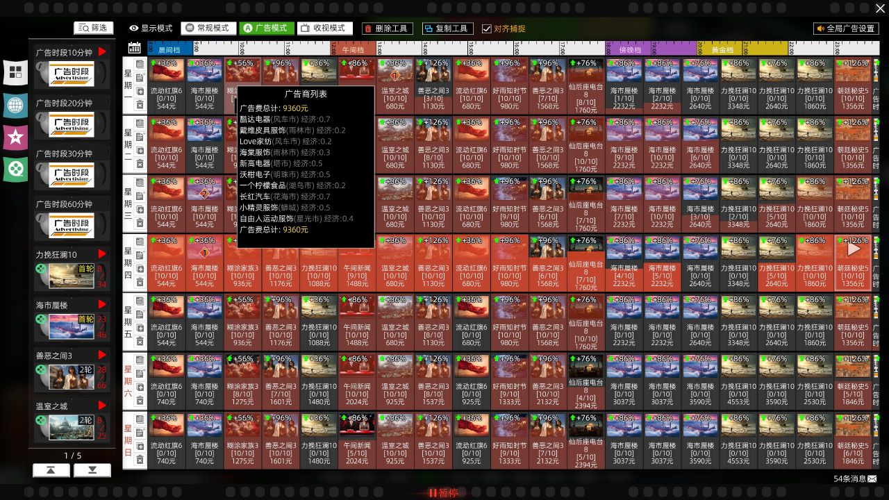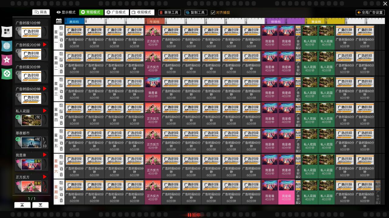 從週一到週日、從0點到24點,每個時間段的電視節目排檔可以自由設置。你可兩三個電視節目間,插入密密麻麻的電視廣告。當然,這樣並不會提高收入,反而會降低電視收視率。